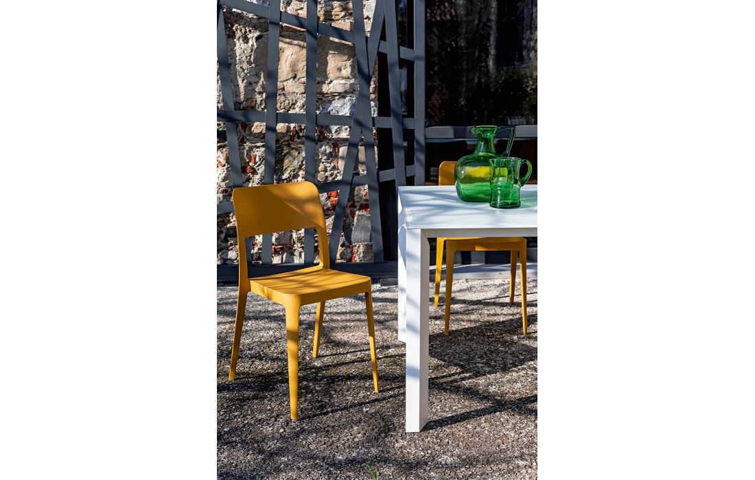 Mesa de jantar extensível com base deslizante em aço pintado. Tampo em vidro ou cerâmica.