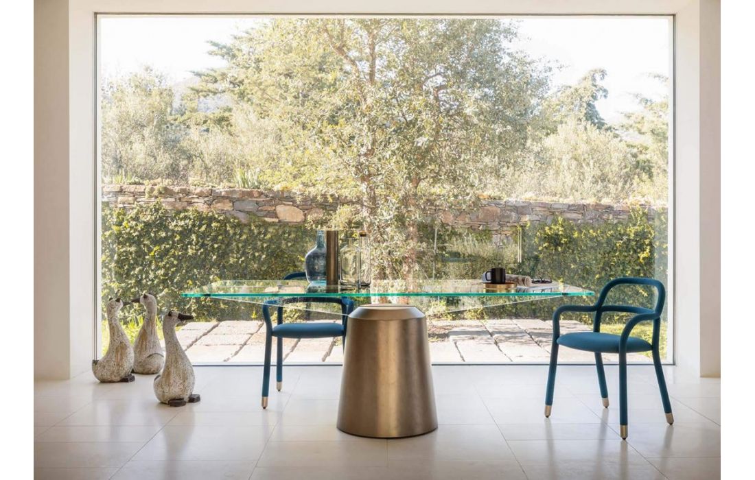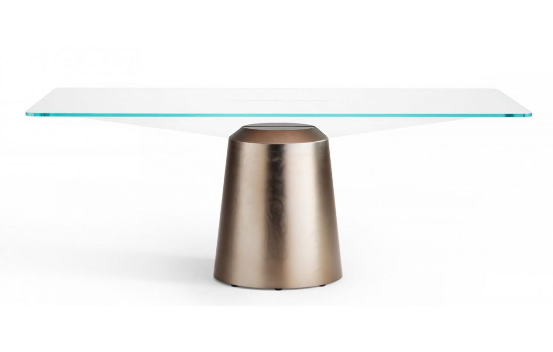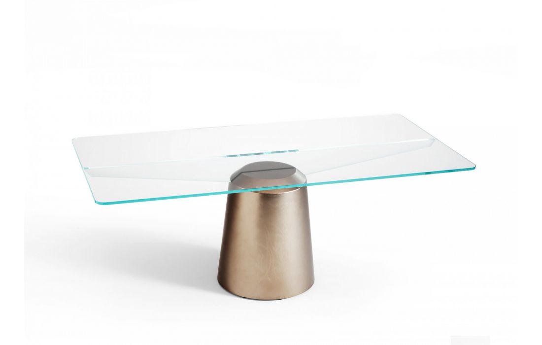 Mesa de jantar com base central em metal pintado e com tampo retangular ou redondo em vidro transparente ou fumê
