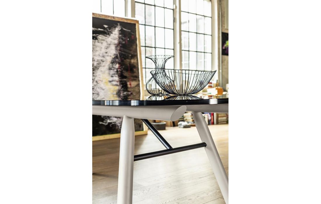 Mesa de jantar com base em madeira de quatro pés e apoios em metal lacado. Tampo em forma de barril em vidro
