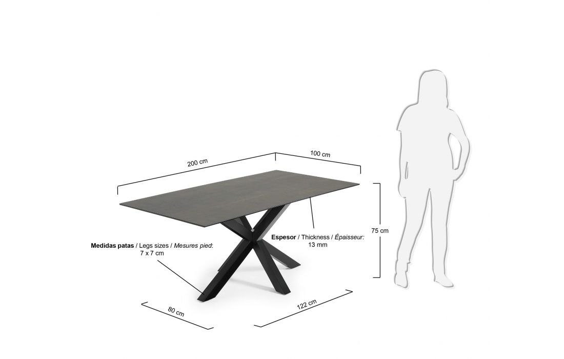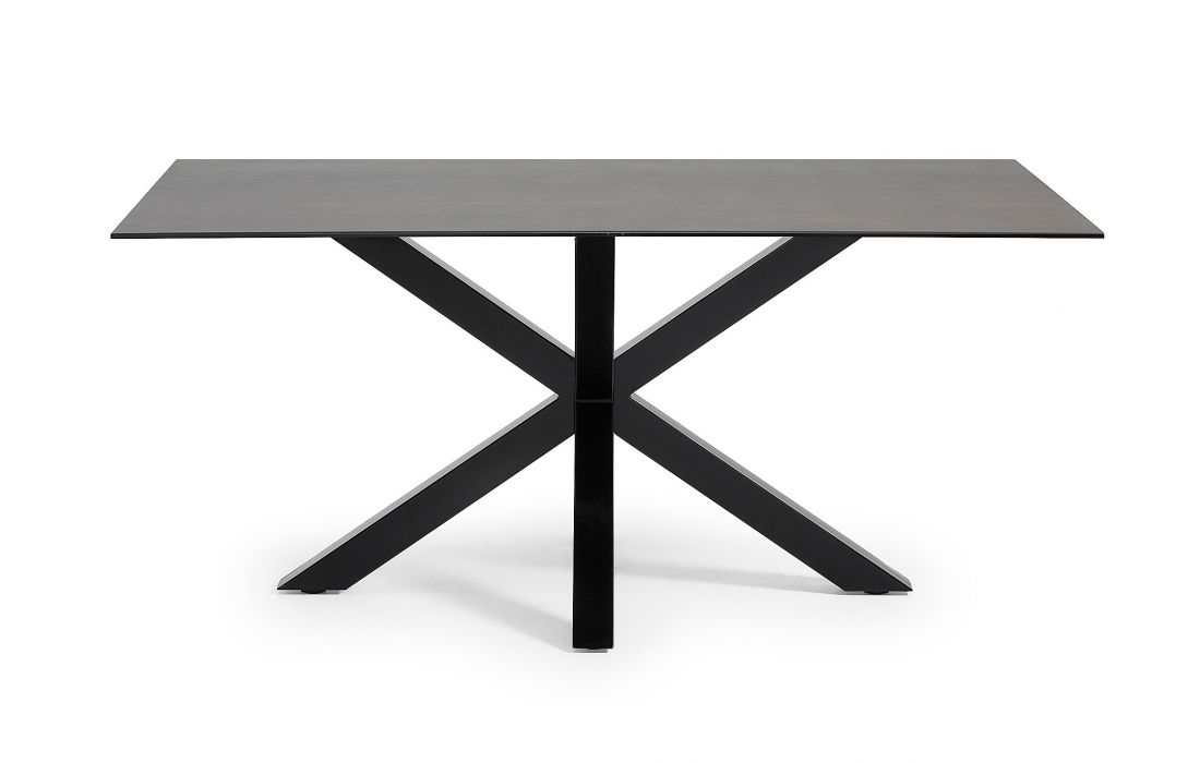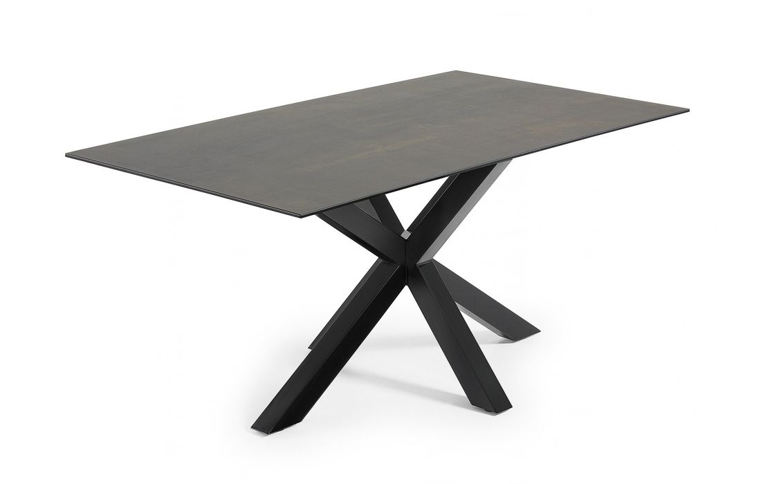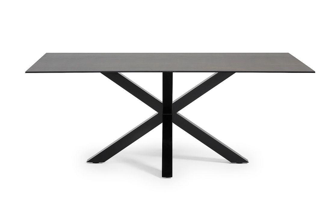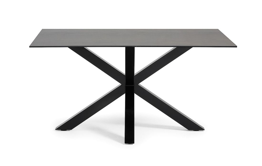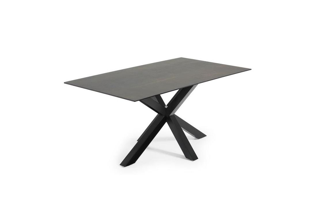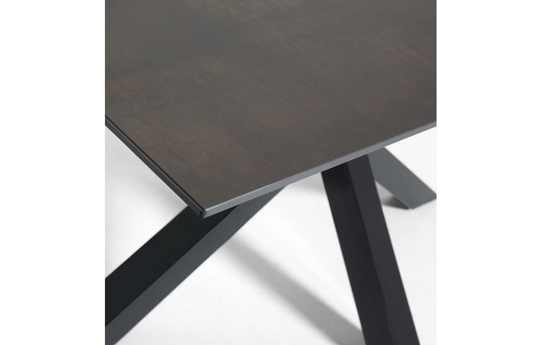 Mesa com pés em aço de cor preto, com tampo em porcelana iron moss pousado sobre vidro.