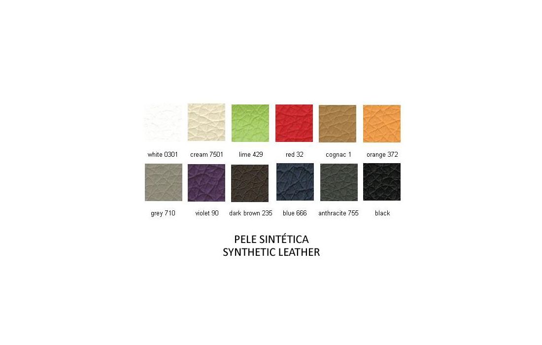 Cromado, almofadas de enchimento em espuma de alta resiliência; em pele genuína ou pele sintética; tiras de couro.