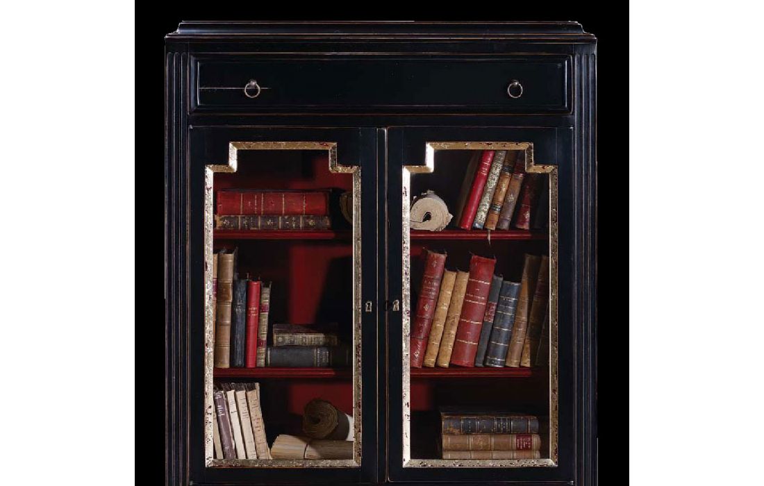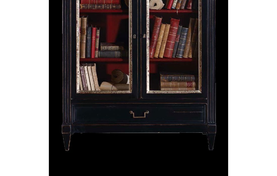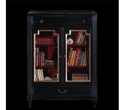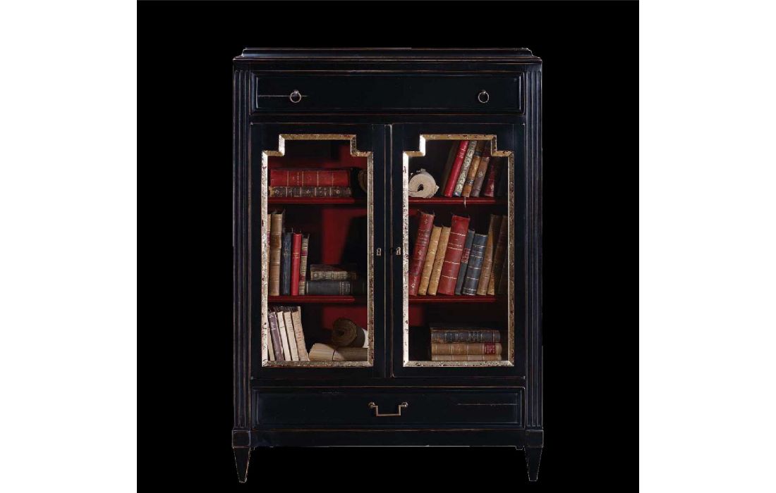 Livreiro com 2 portas de vidro e 2 gavetas, design provençal e pormenor em folha de ouro com possibilidade de vários acabamentos.