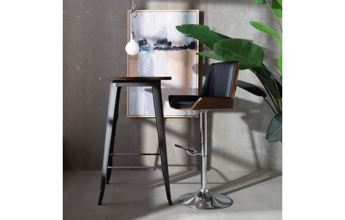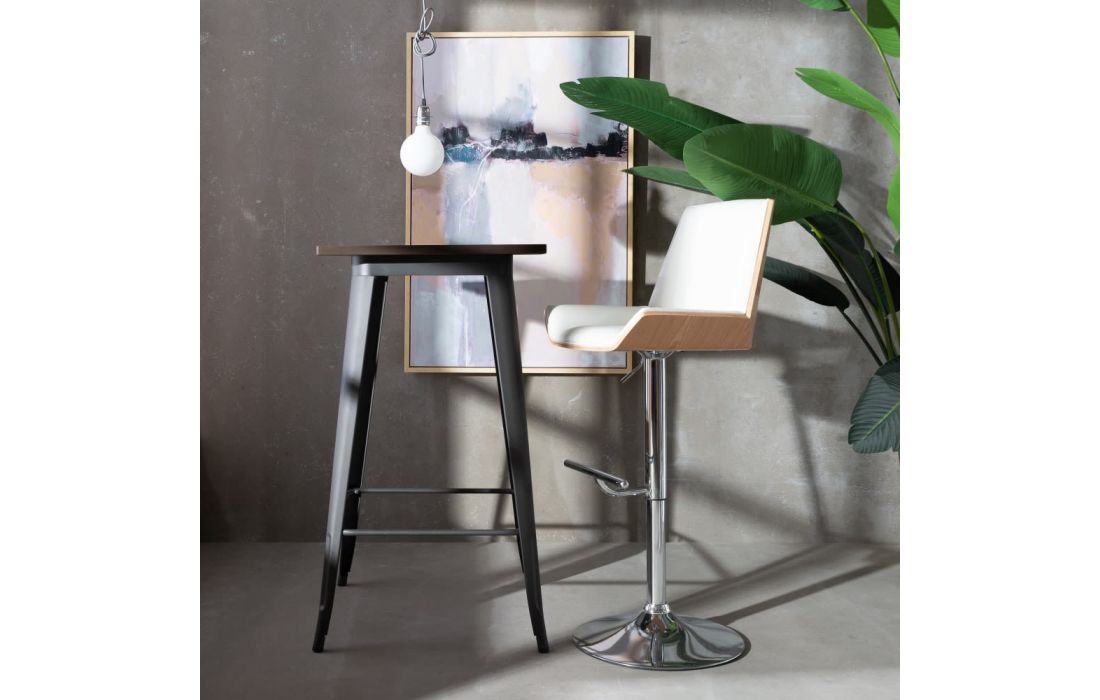 Prazo de entrega: 30/45 diasBanco bar com pés em metal com costa em nogueira ou carvalho cinza com assento e encosto revestido em pele sintética ou pele genuína