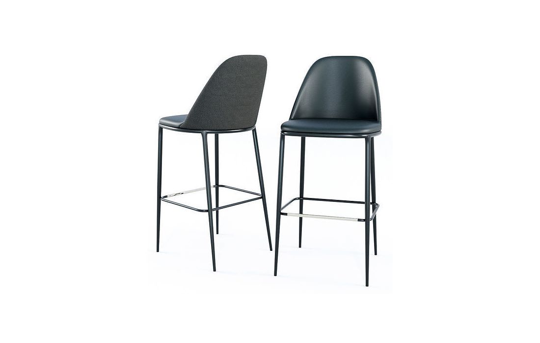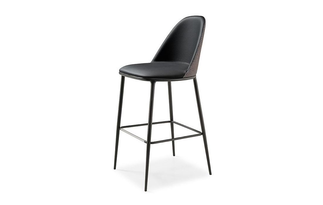 Banco bar em pele sintética e costa exterior em tecido, com estrutura em metal.Destinatário :