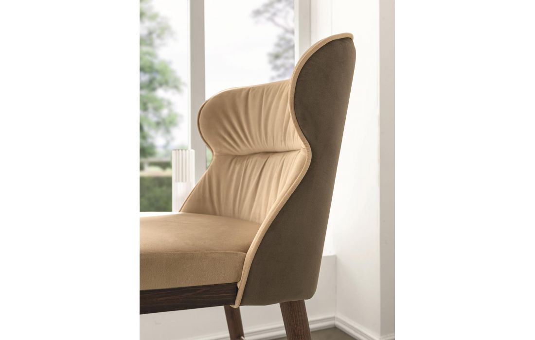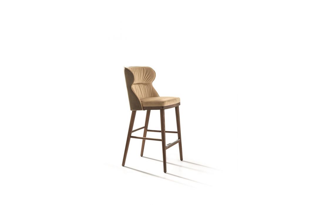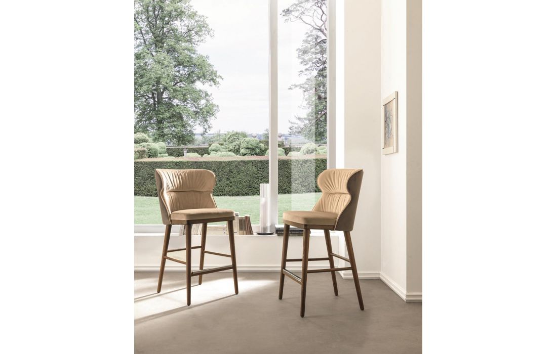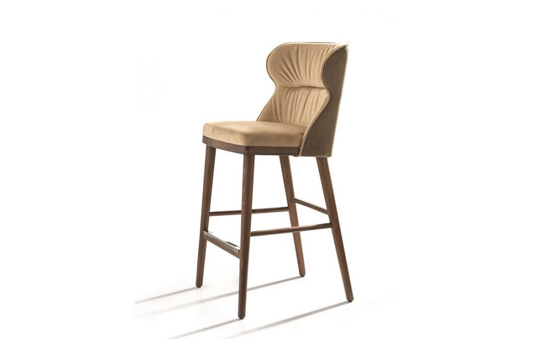 Banco bar com pernas cónicas disponíveis em freixo tingido e encosto bicolor em tecido.