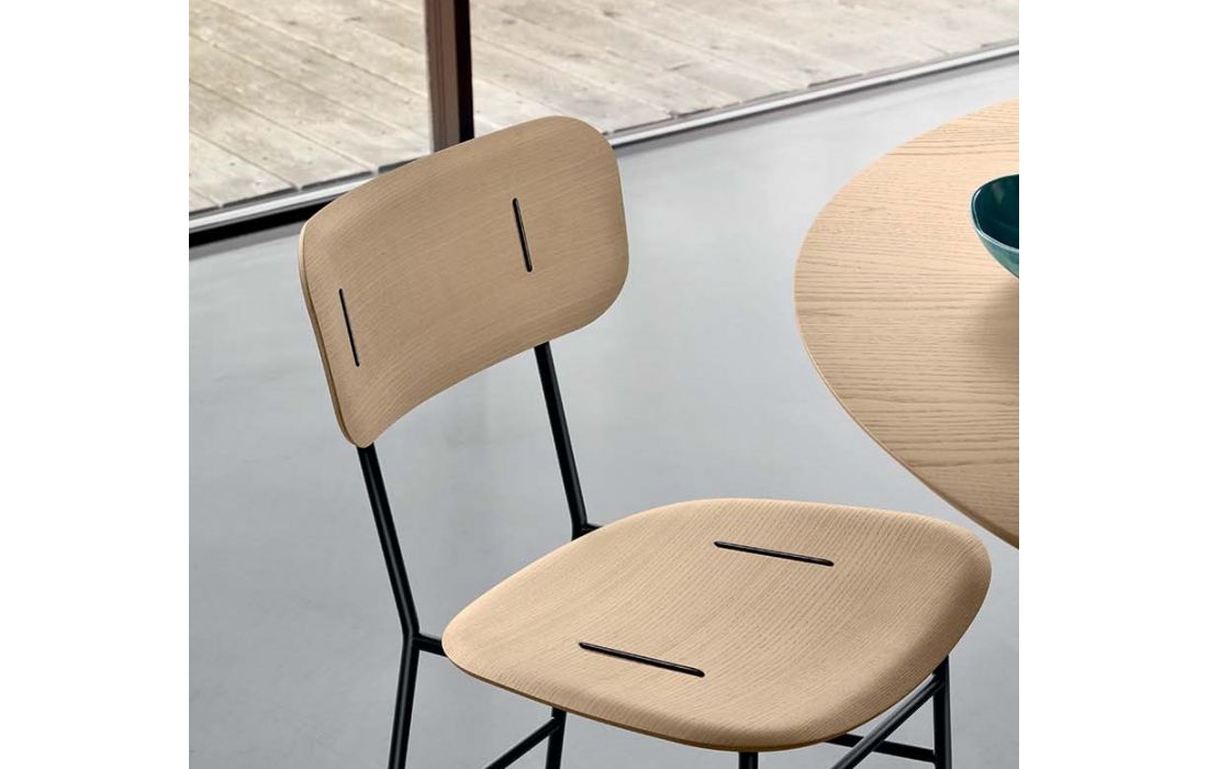Banco bar com base de metal de quatro pés. Assento e encosto em madeira folheada, com aplicações metálicas na mesma cor da estrutura, porcas borboletas em metal preto.Destinatário :