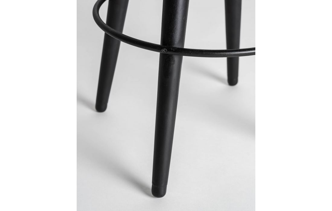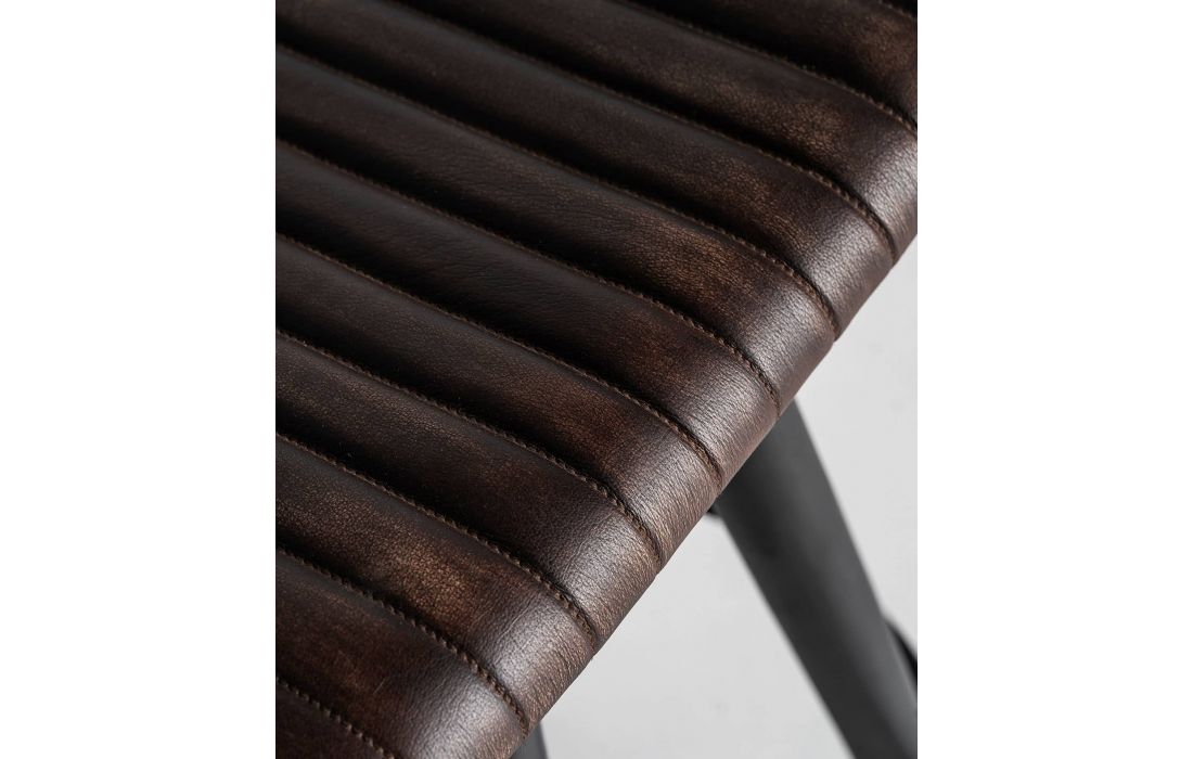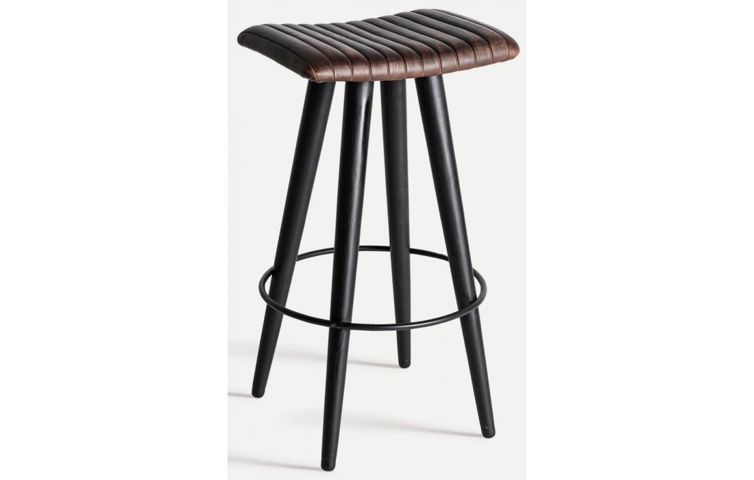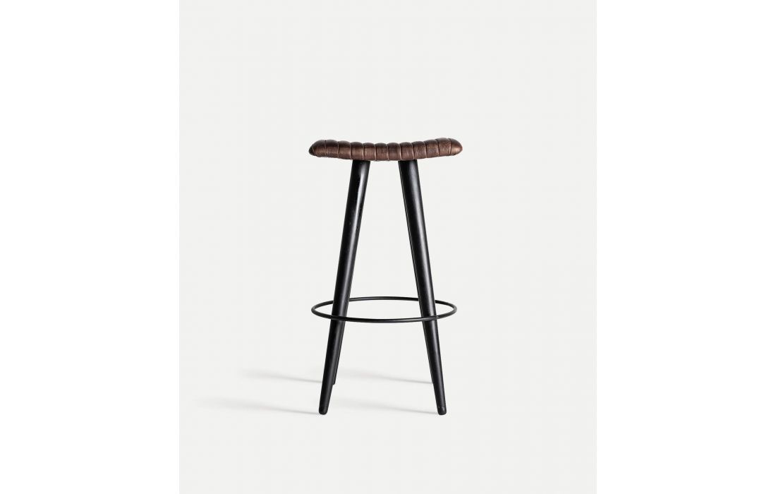 Banco alto em pele preta com base em tripé em metal. O seu estilo industrial vintage destaca-se em bares ou cozinhas modernas, proporcionando um toque decorativo e funcional. O assento acolchoado com linhas decorativas oferece conforto e estilo.
