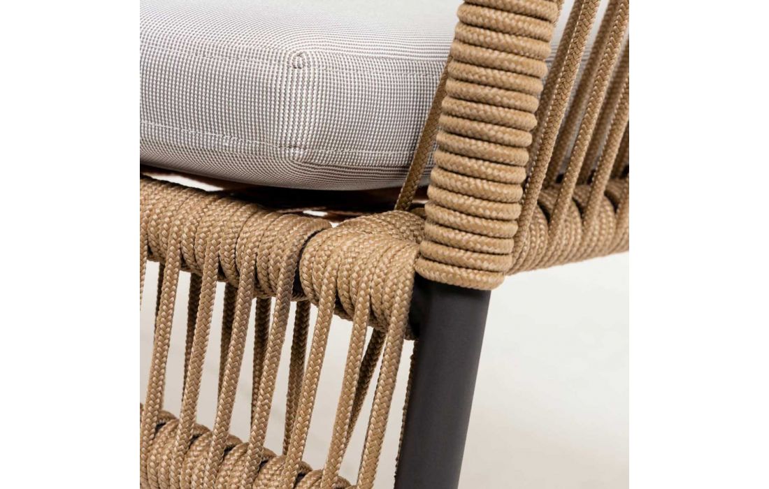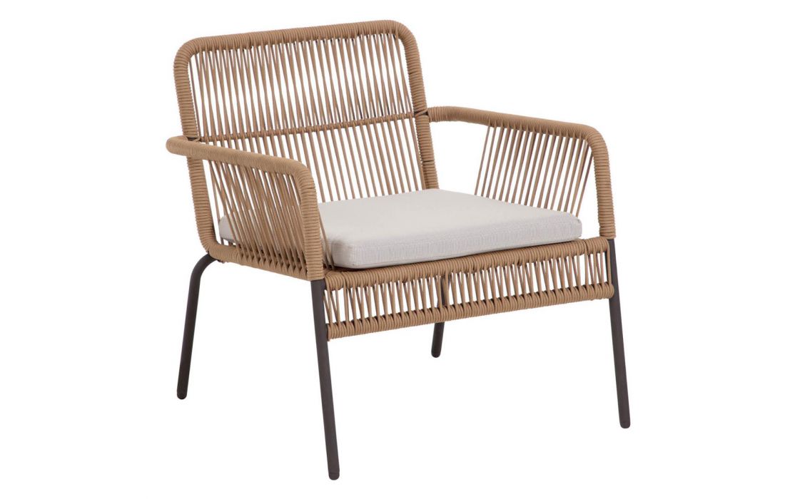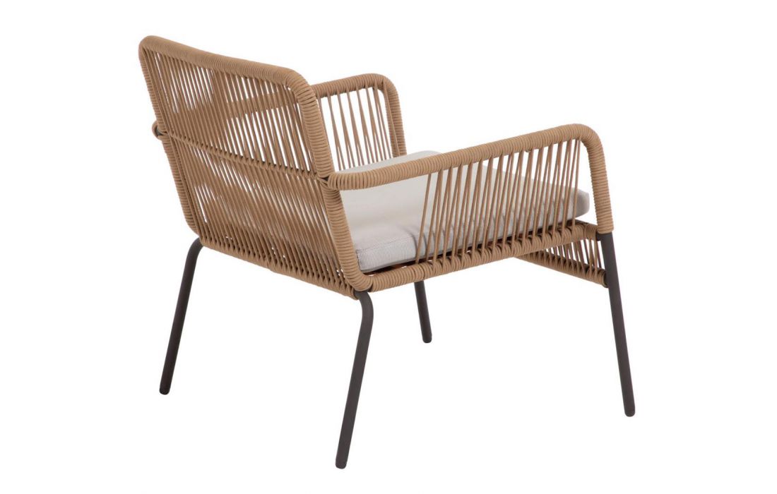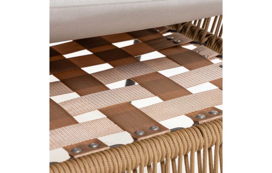 Poltrona com estrutura em aço galvanizado assento e encosto com cordas de poliéster bege para uso exterior.