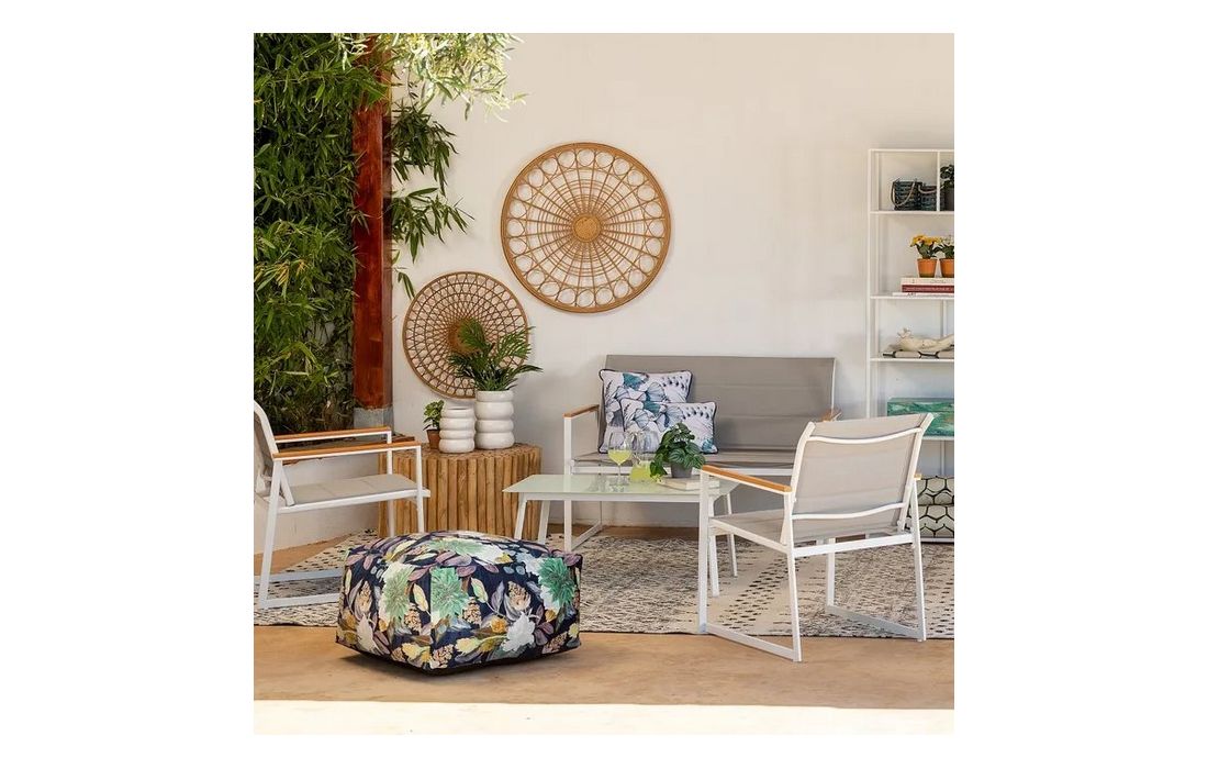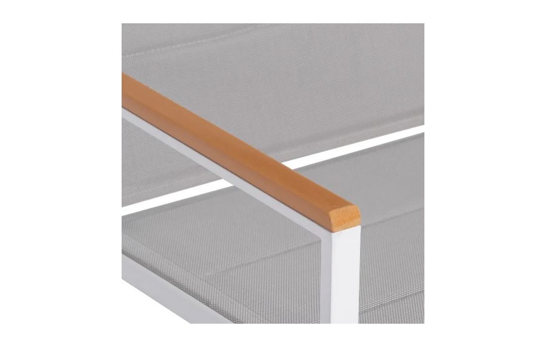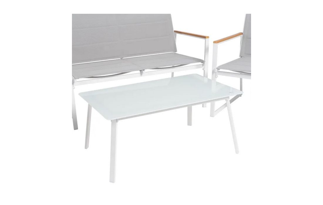 Conjunto de exterior em alumínio branco e promenores em madeira constituido por cadeirão, sofá e mesa de centro com vidro temperado de 0,5mm.