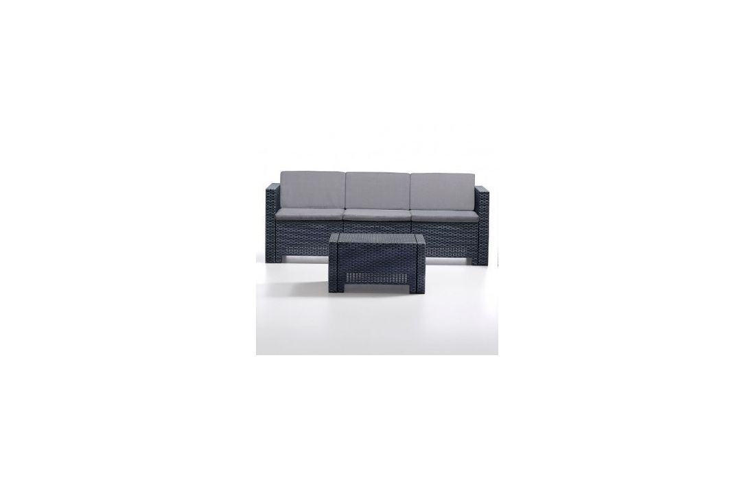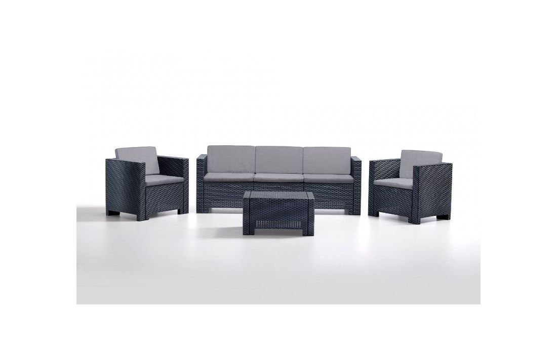 Conjunto de exterior em ratan sintético na cor cinza constituido por duas poltronas, 1 sofá de 3 lugares, mesa de centro e almofadas na cor cinza.