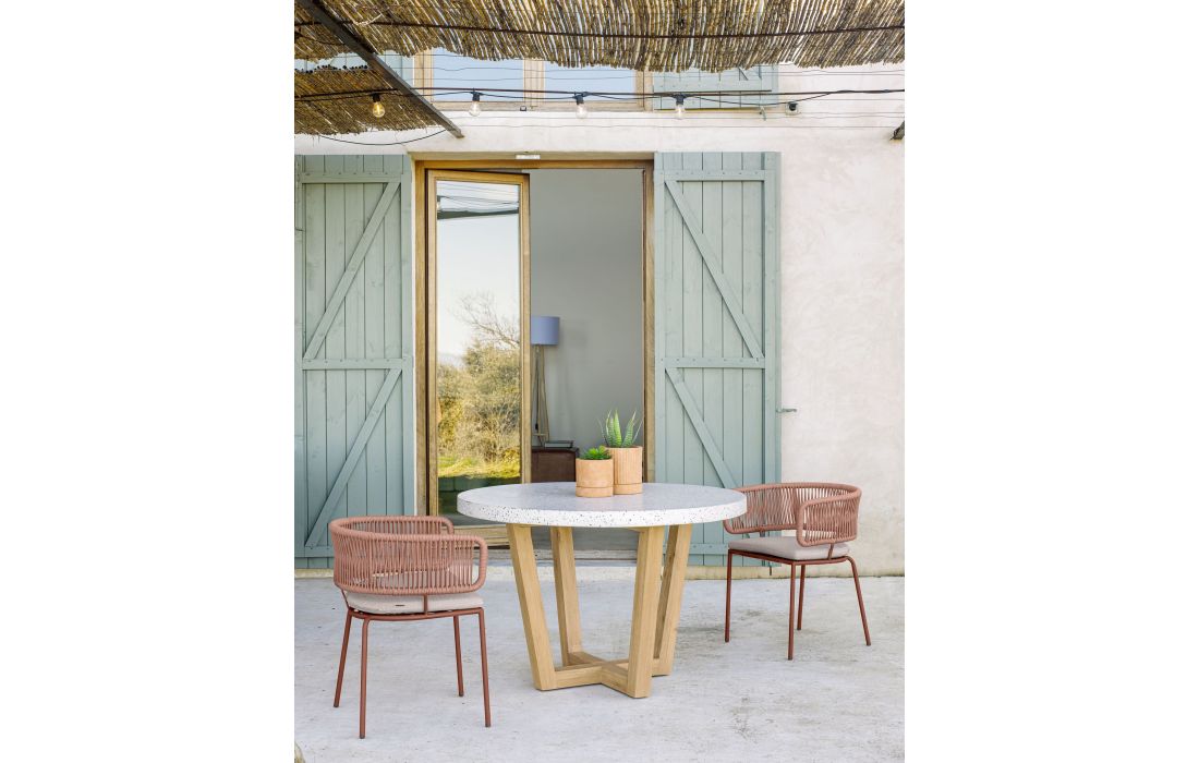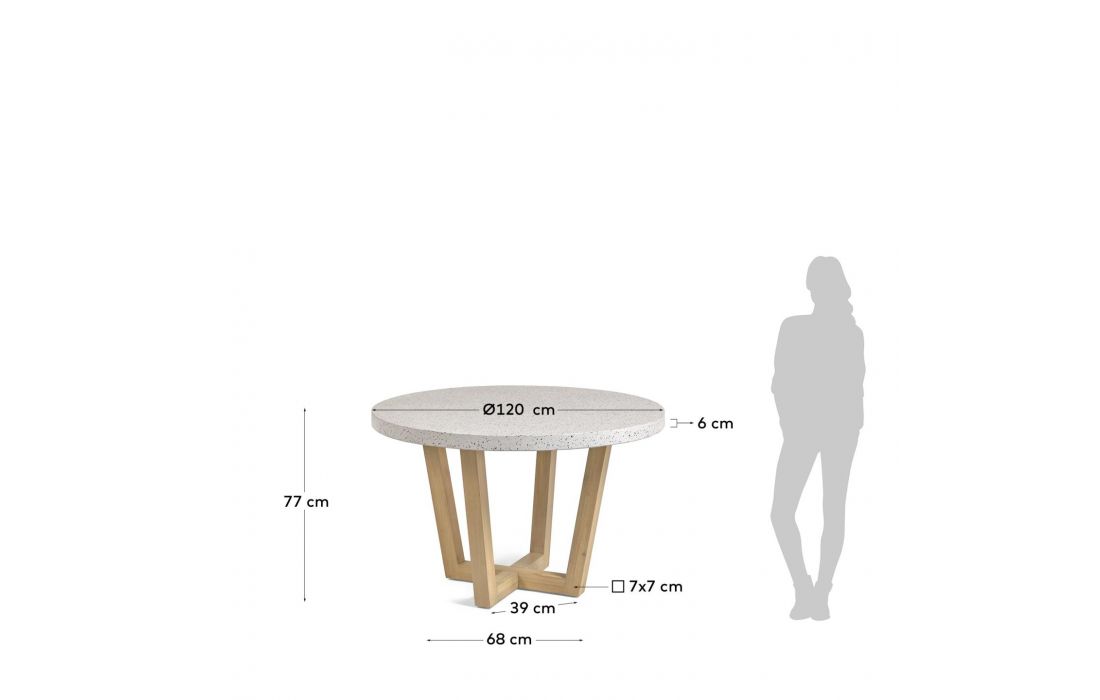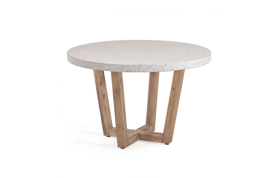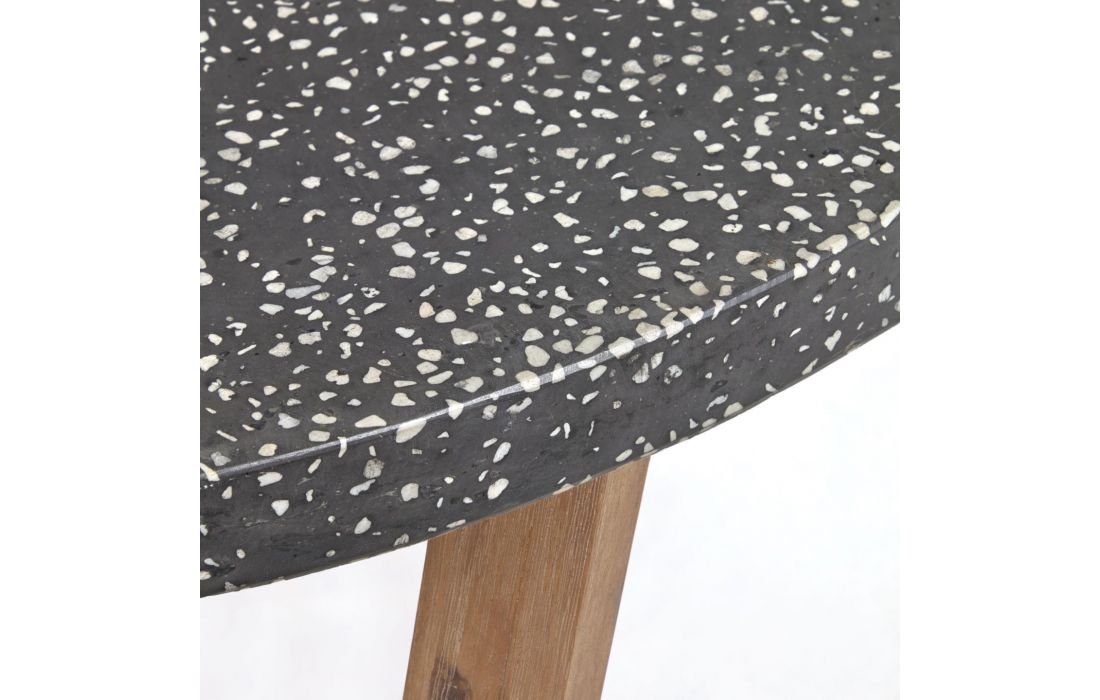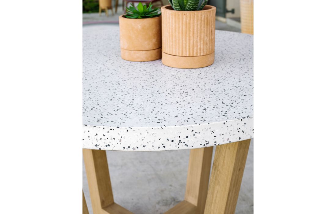 Mesa redonda com tampo terrazzo e estrutura feita com madeira maciça de acácia com acabamento branqueado.