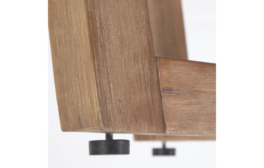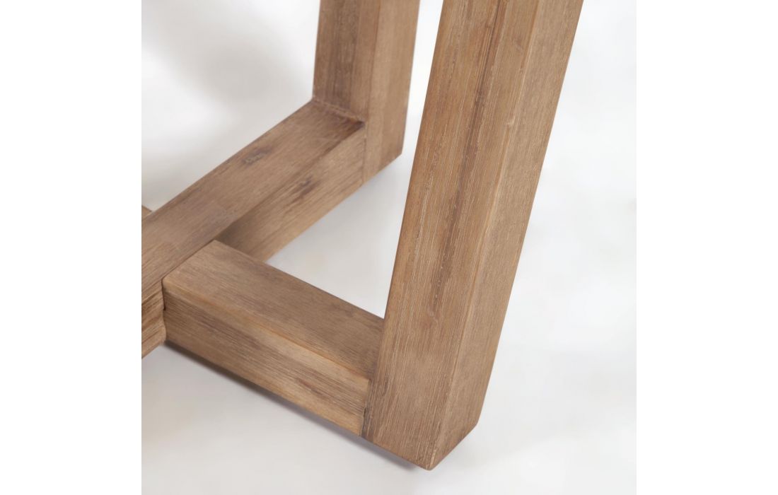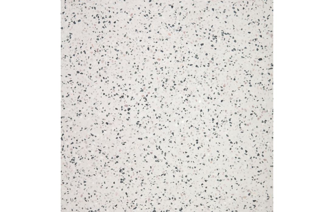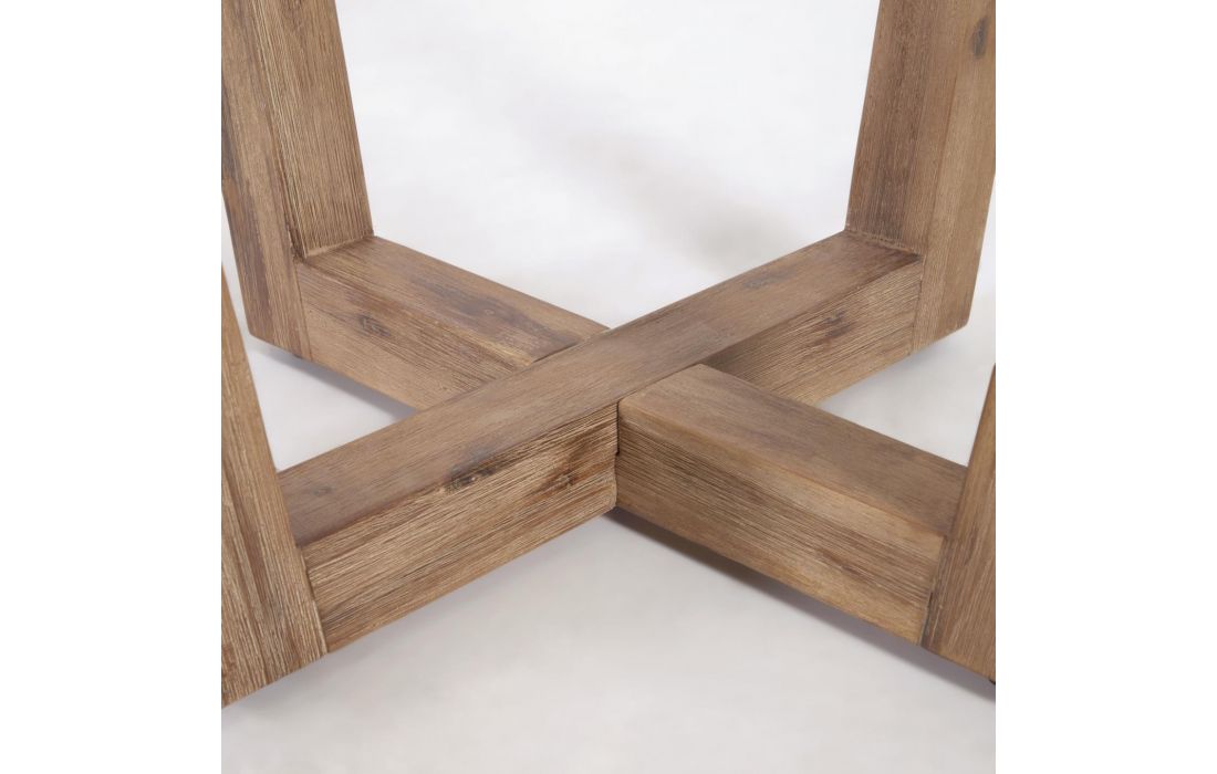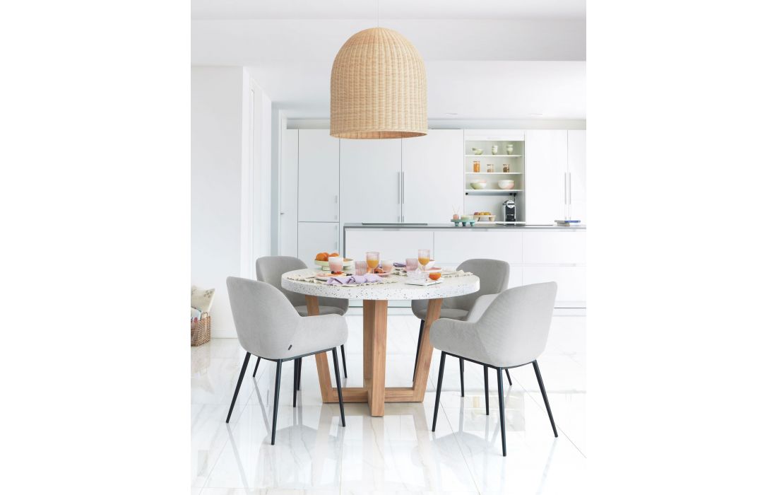 Mesa redonda com tampo terrazzo e estrutura feita com madeira maciça de acácia com acabamento branqueado.
