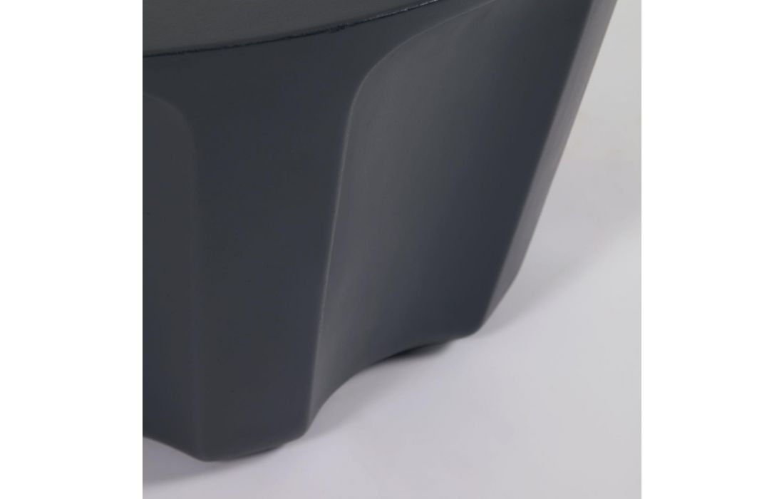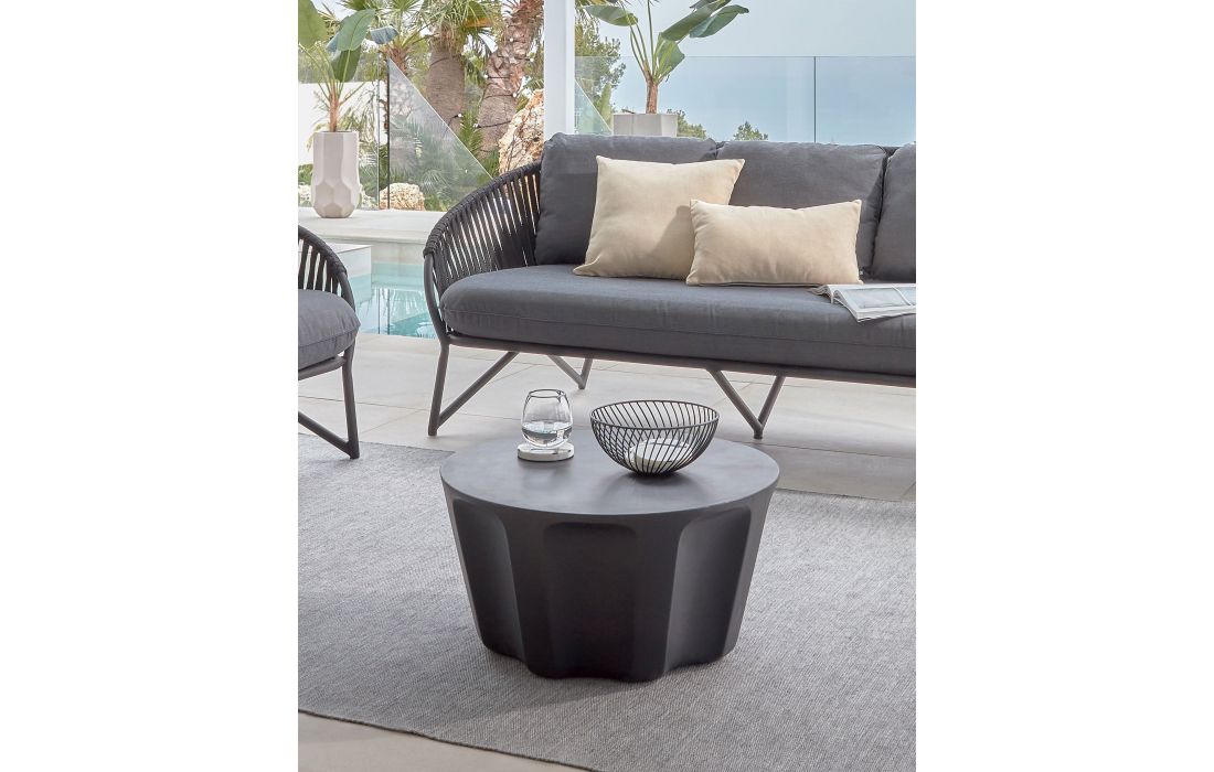 Mesa de centro redonda de exterior em cimento com acabamento na cor preto.