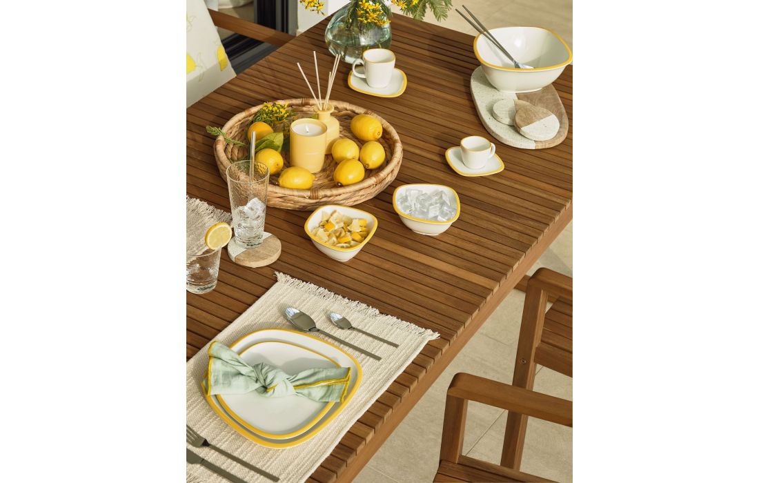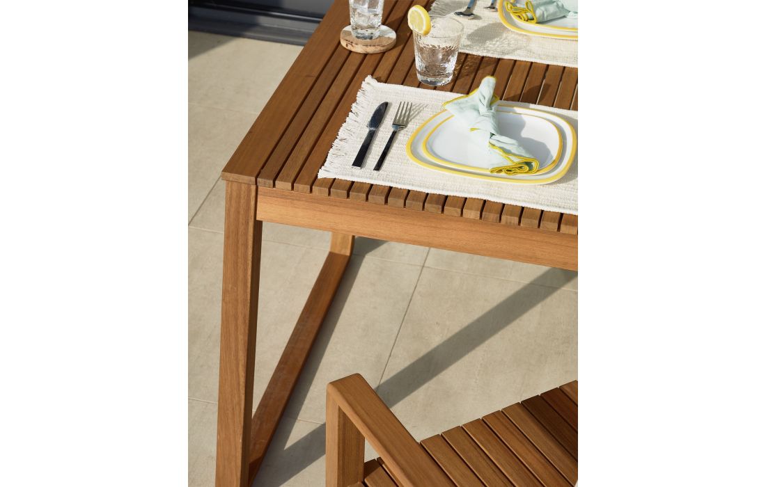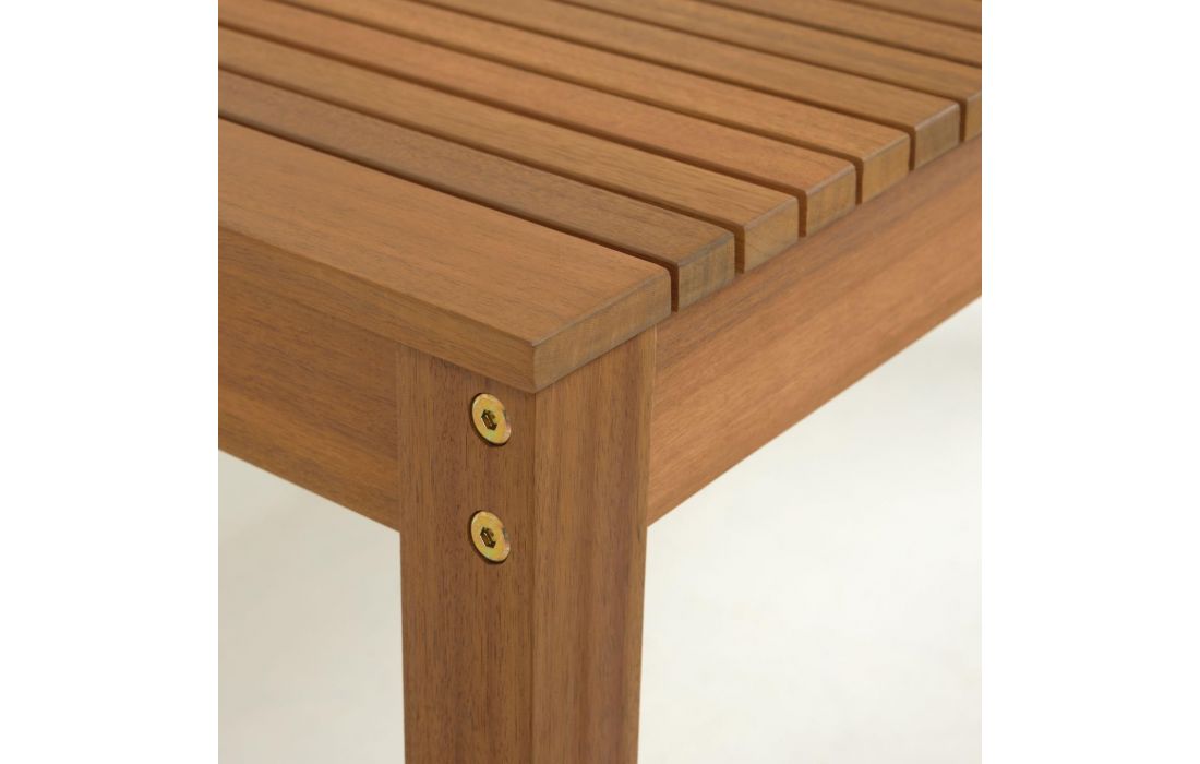 Especificações do Produto Madeira de Acácia 100% FSC Não fazemos qualquer alteração ao produto Manutenção e Limpeza Limpar com uma solução de sabão suave e secar de imediato. Recomendamos que envernize / volte a pintar os móveis regularmente, uma vez por ano, para evitar que crie fissuras e a absorção da humidade Legenda de medidas (L)Largura (P) Profundidade(A) Altura