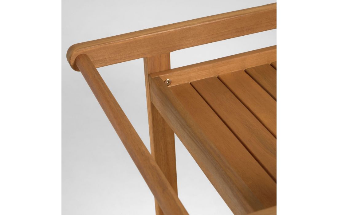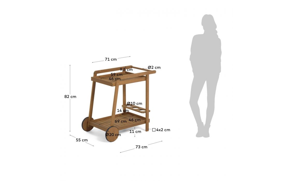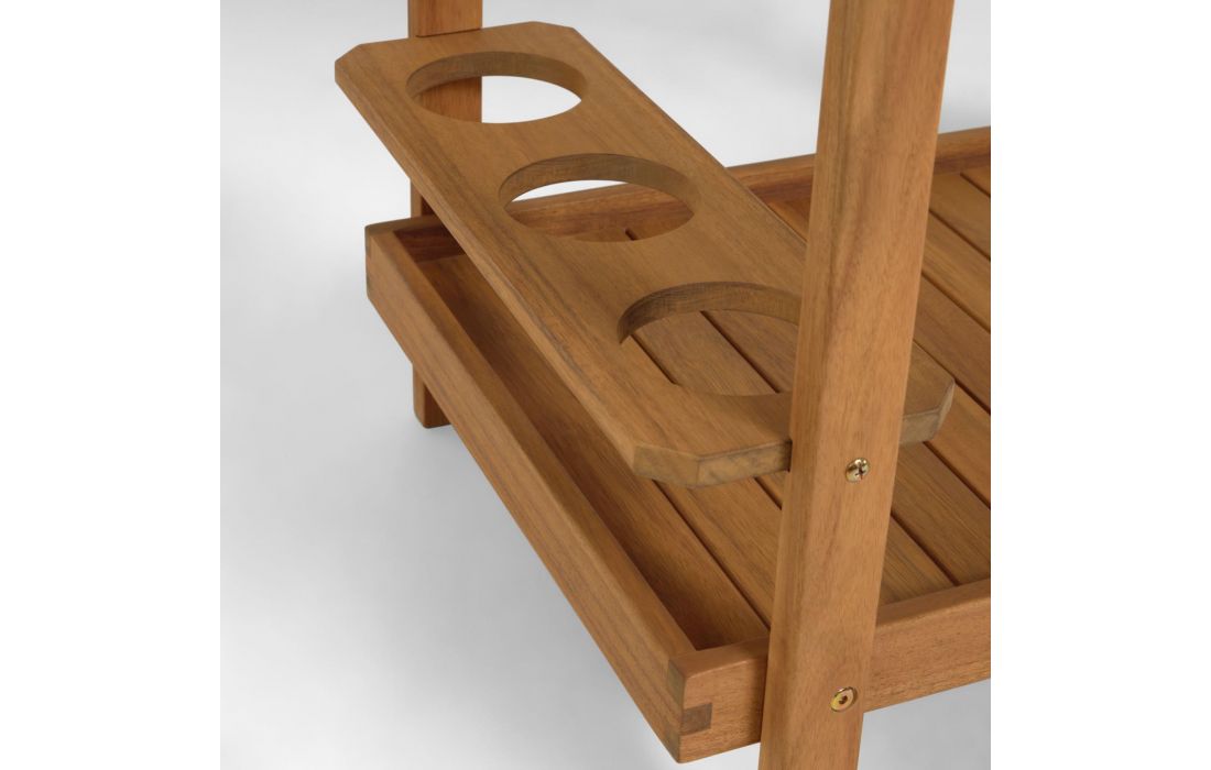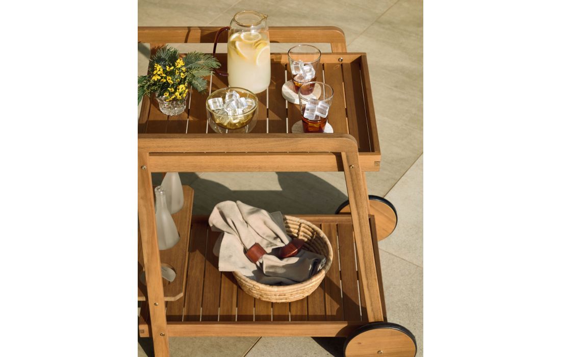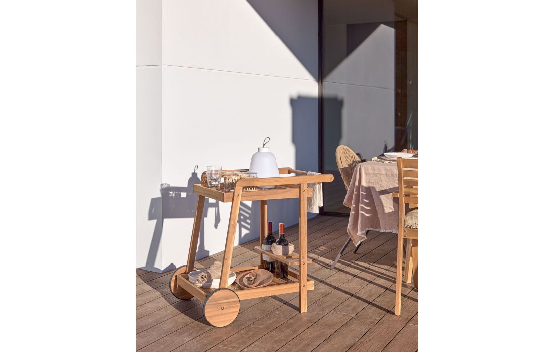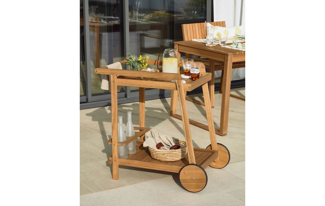 Mesa carrinho feita em madeira maciça de acácia, tratada com óleo e um acabamento efeito teca.