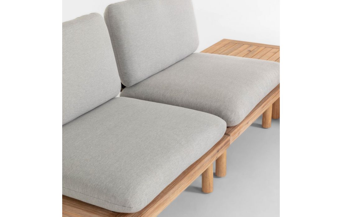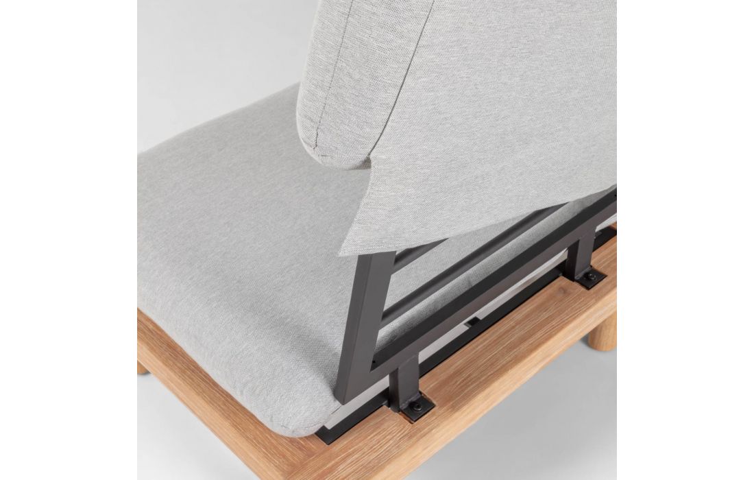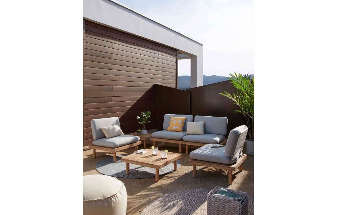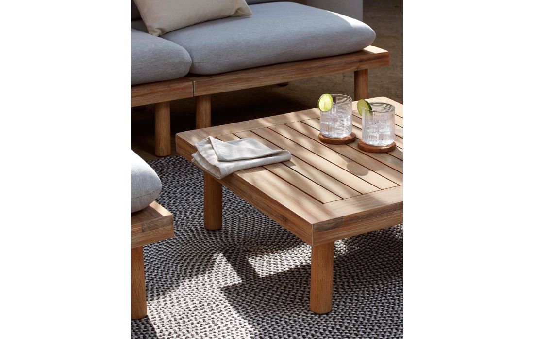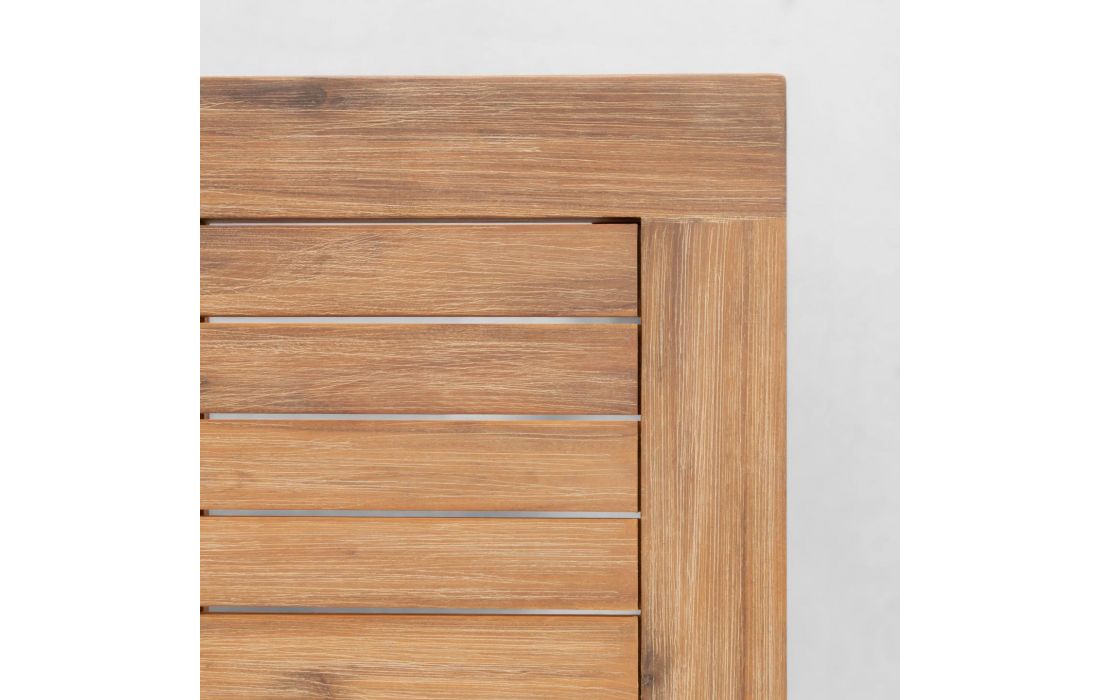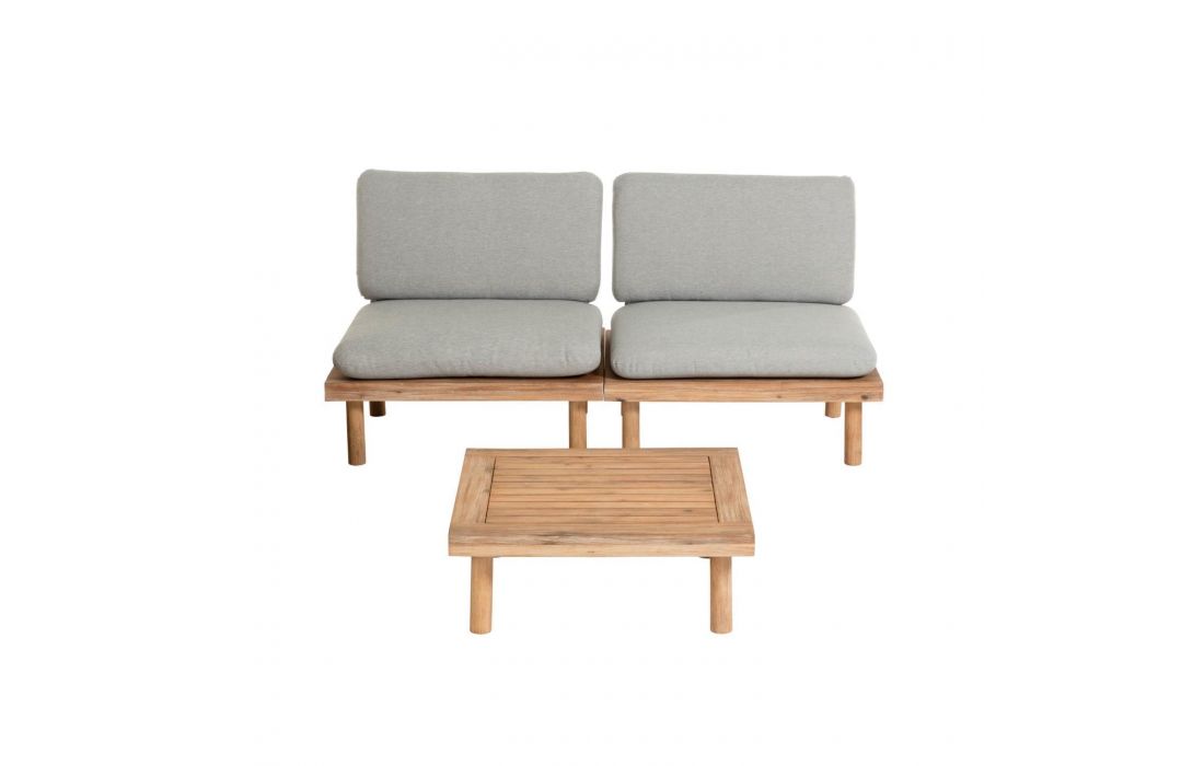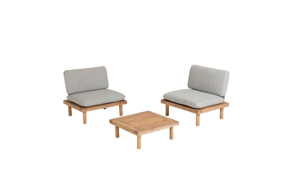 Conjunto de exterior composto por 2 cadeirões e uma mesa feitas em madeira maciça acácia FSC 100%