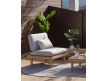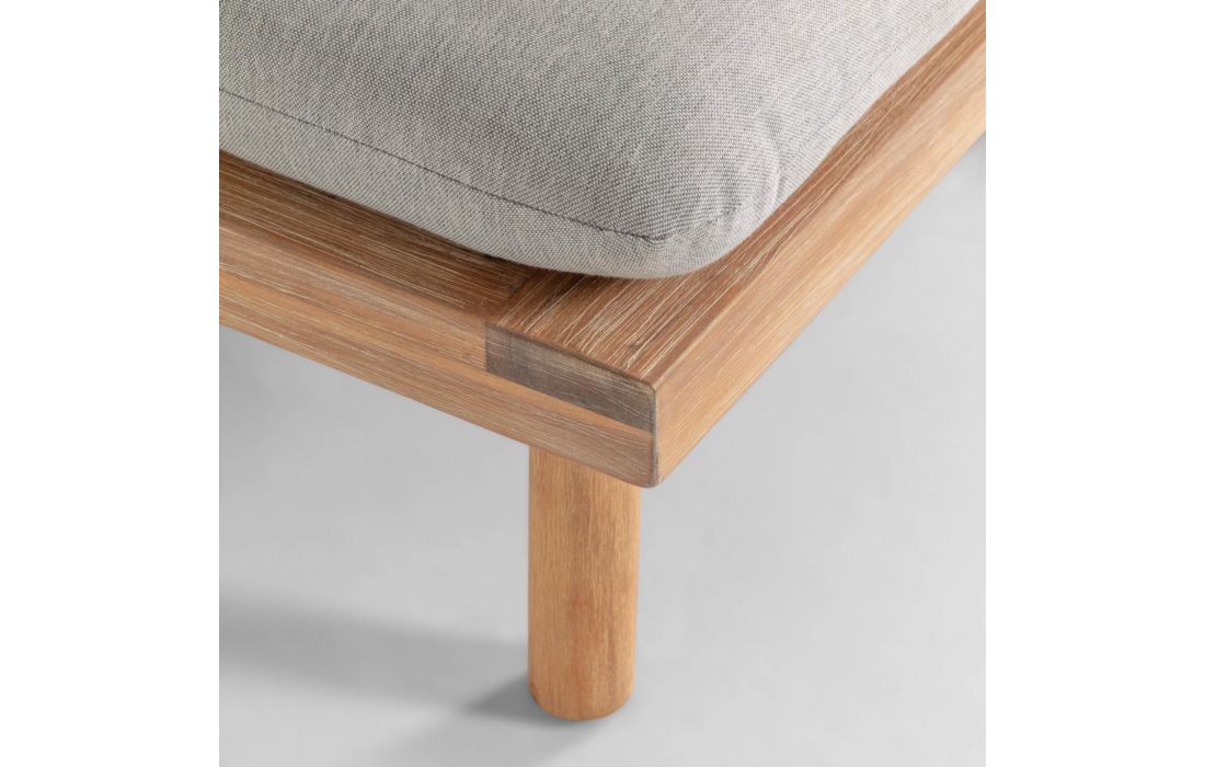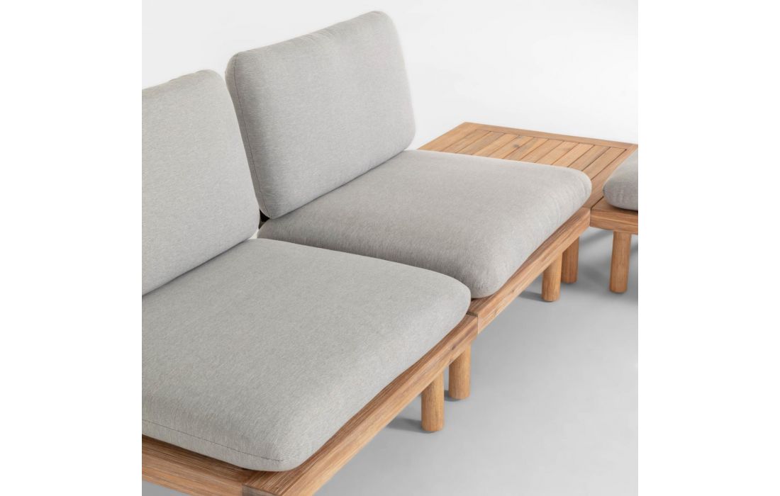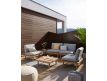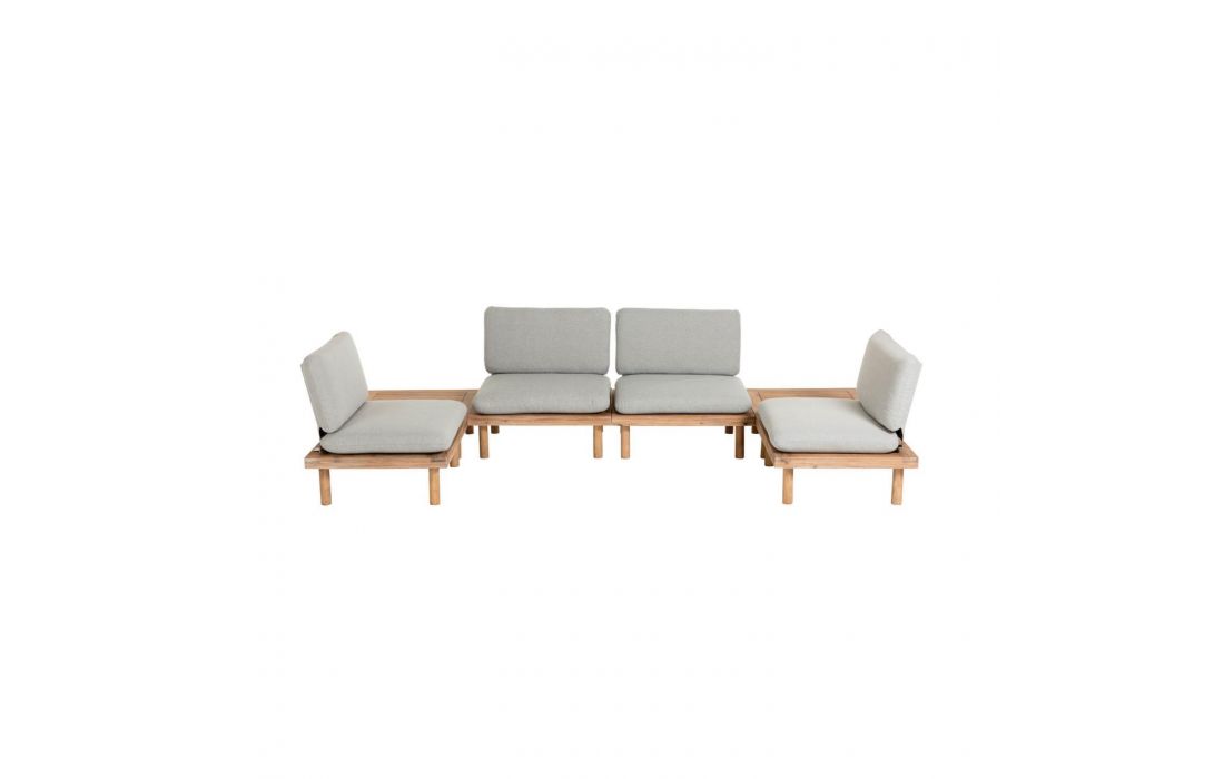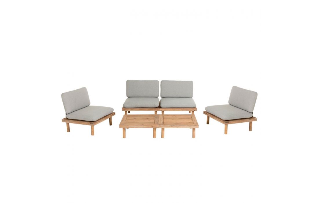 Conjunto de exterior composto por 4 cadeirões e 2 mesas feitas em madeira maciça acácia FSC 100%