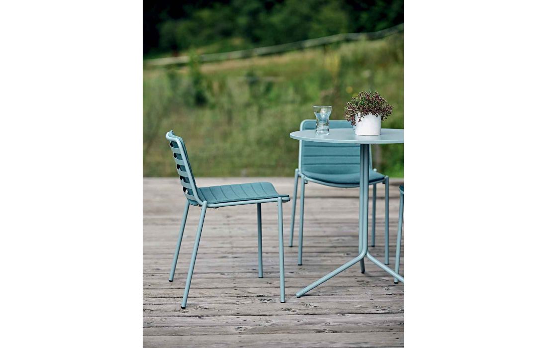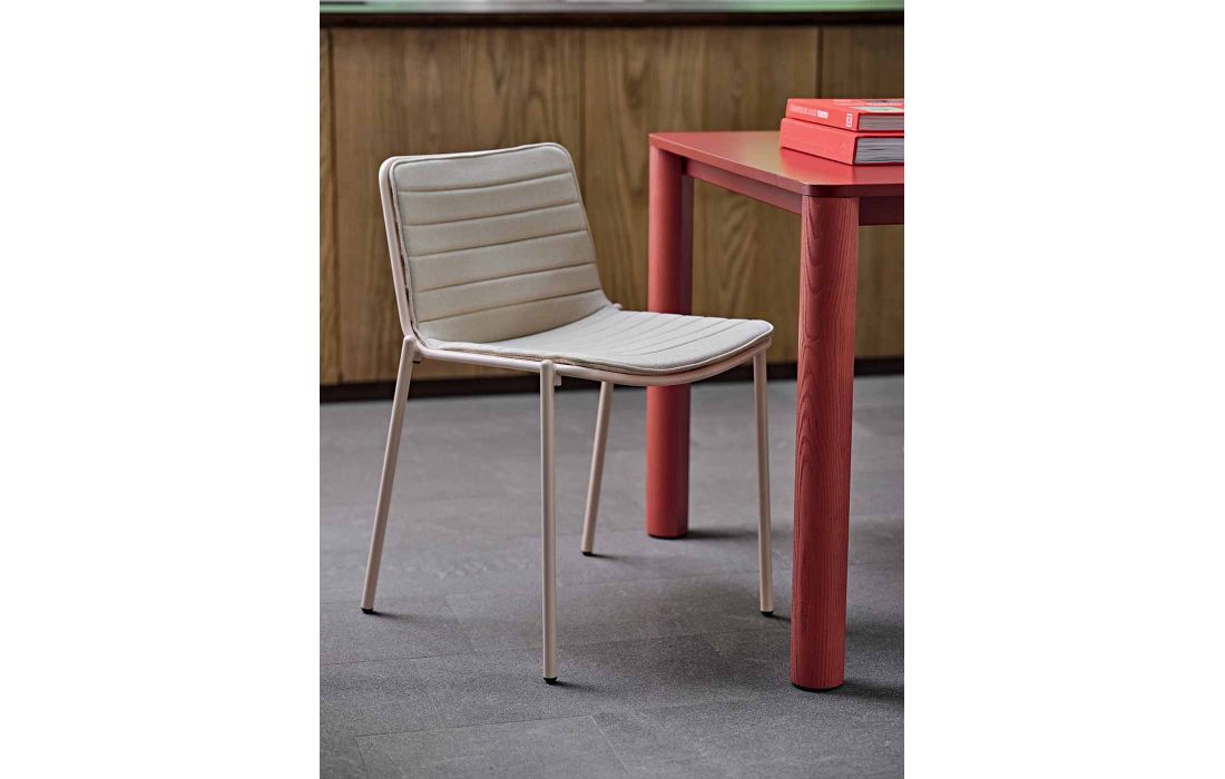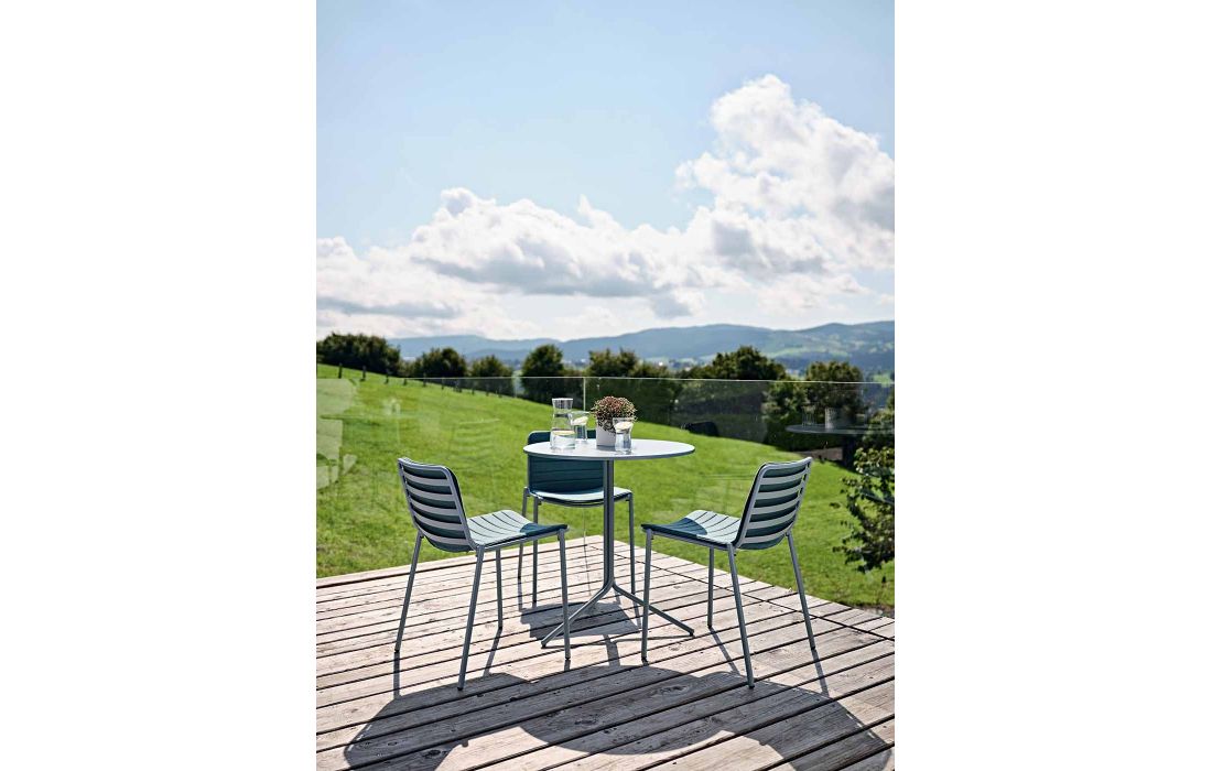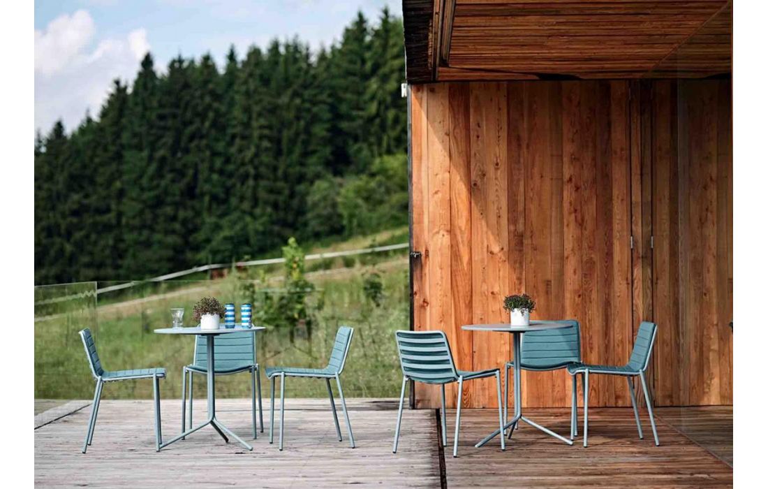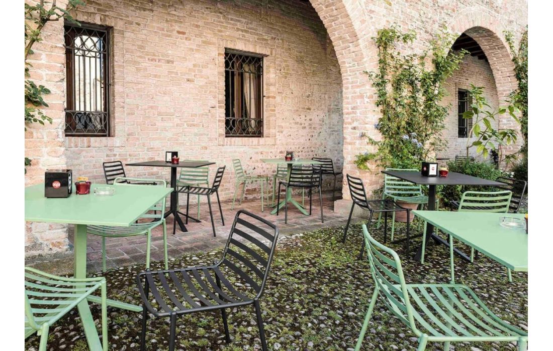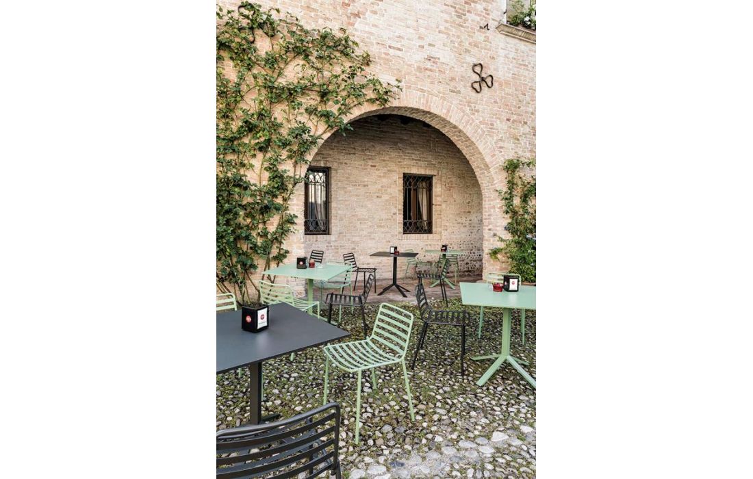 Cadeira com base de quatro pernas em aço lacado, empilhável em até quatro peças e adequada para uso externo.Destinatário :