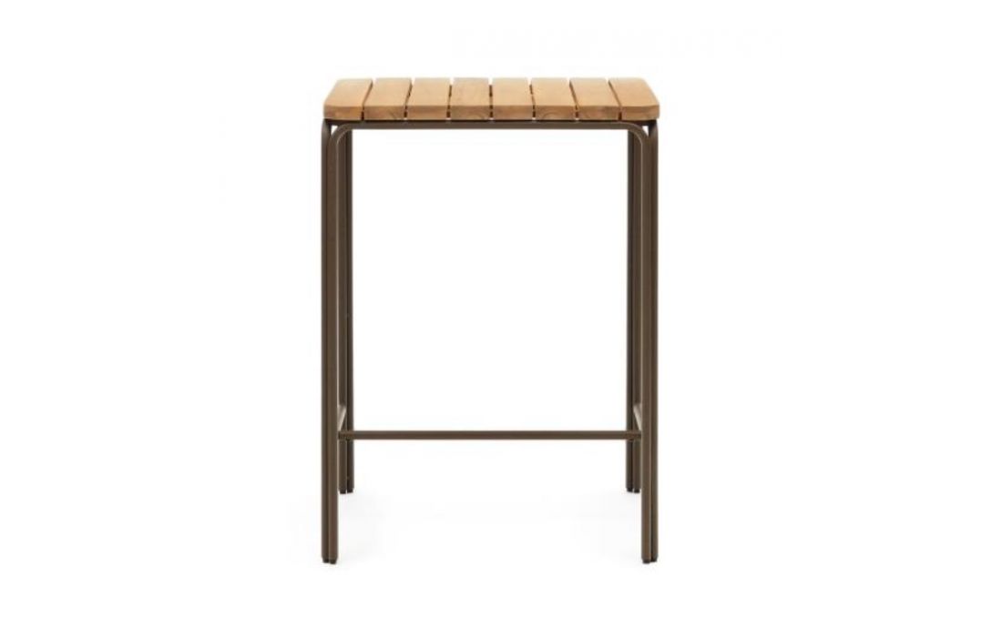 Mesa de jantar de exterior com os pés em aço galvanizado e o tampo em madeira de acaçia .