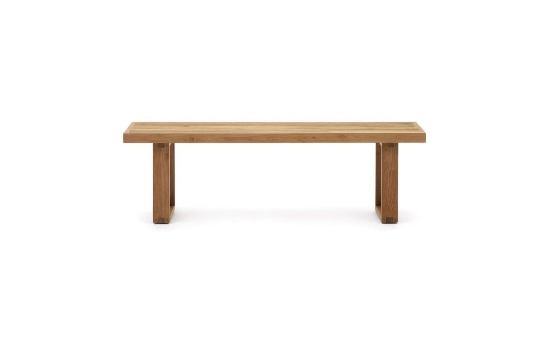 Banco de exterior feito de madeira de teca resistente à humidade.