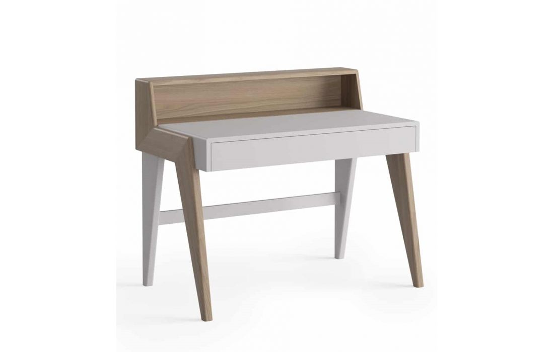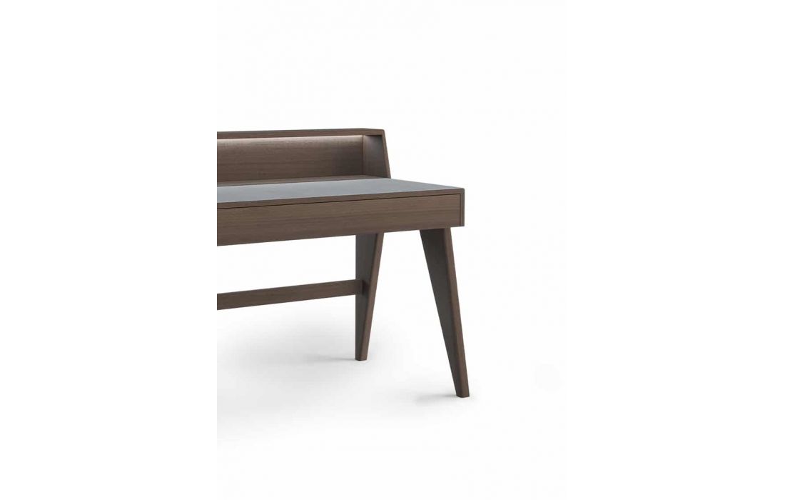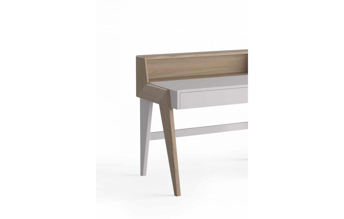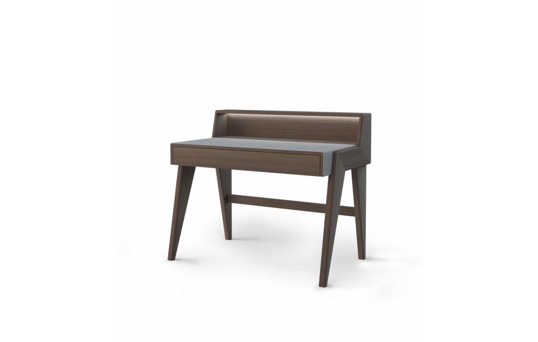 Secretária multifunções em folha de madeira combinada com MDF lacado mate e LED no nicho. Segredo com tampa de levantar para acesso a tomada elétrica e USB. Gaveta organizer com divisórias interiores.