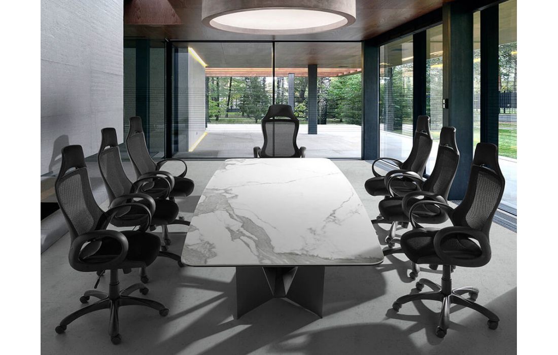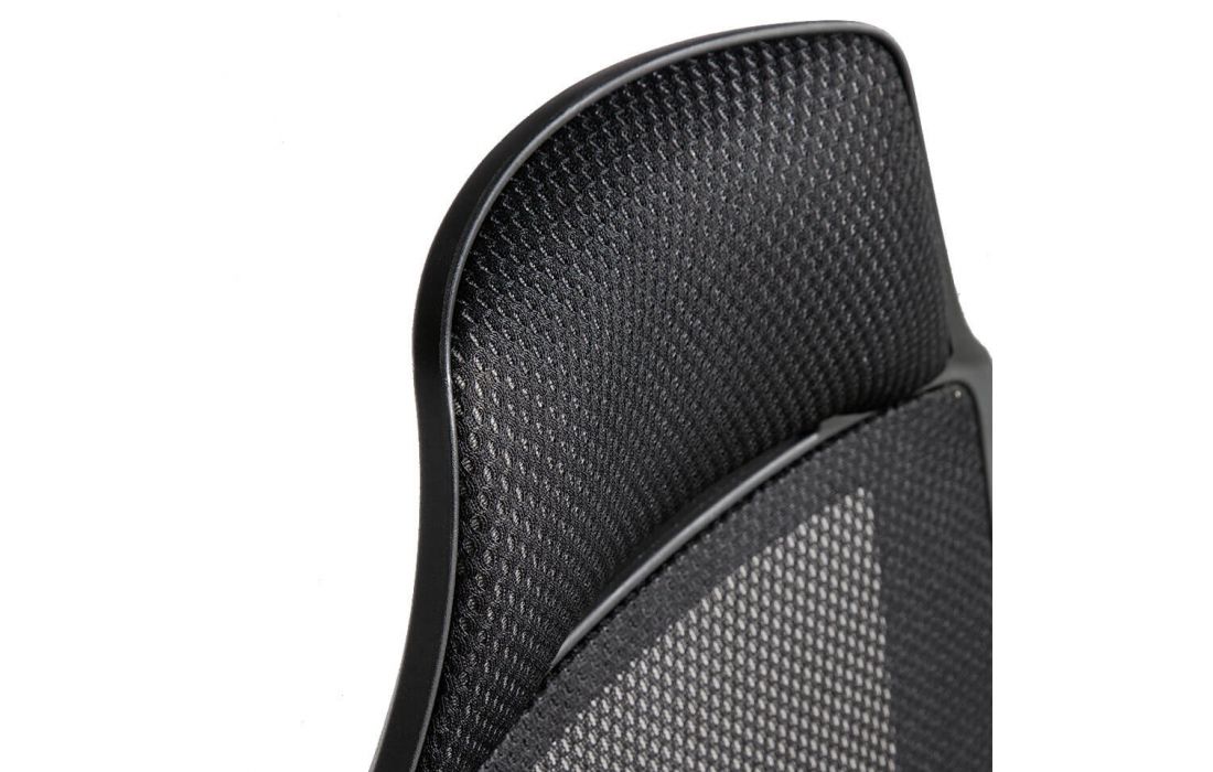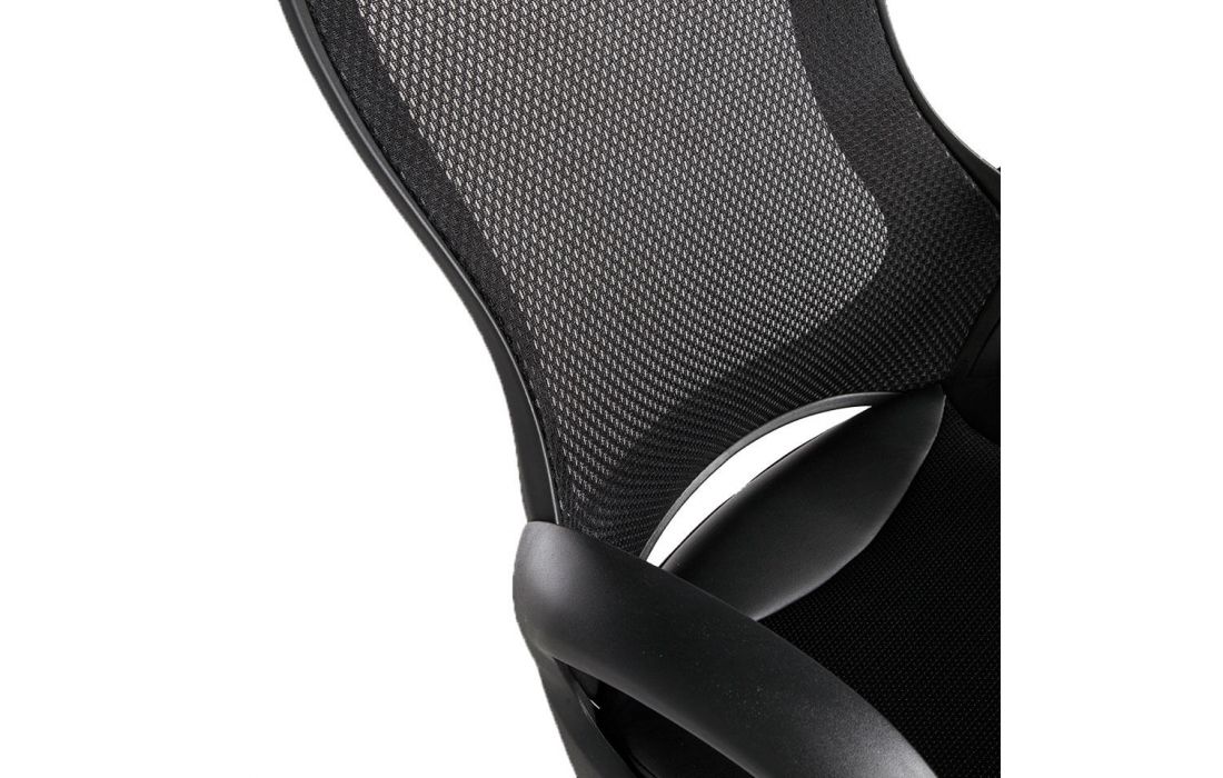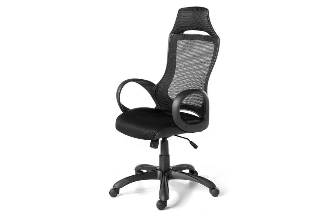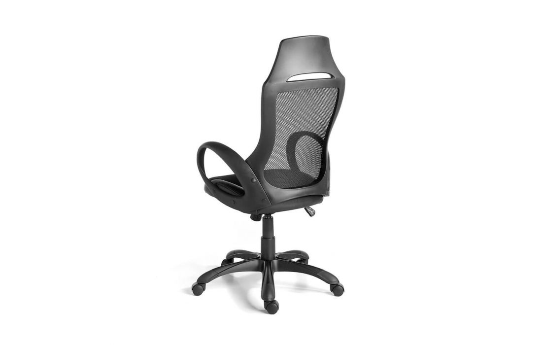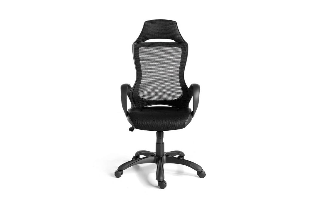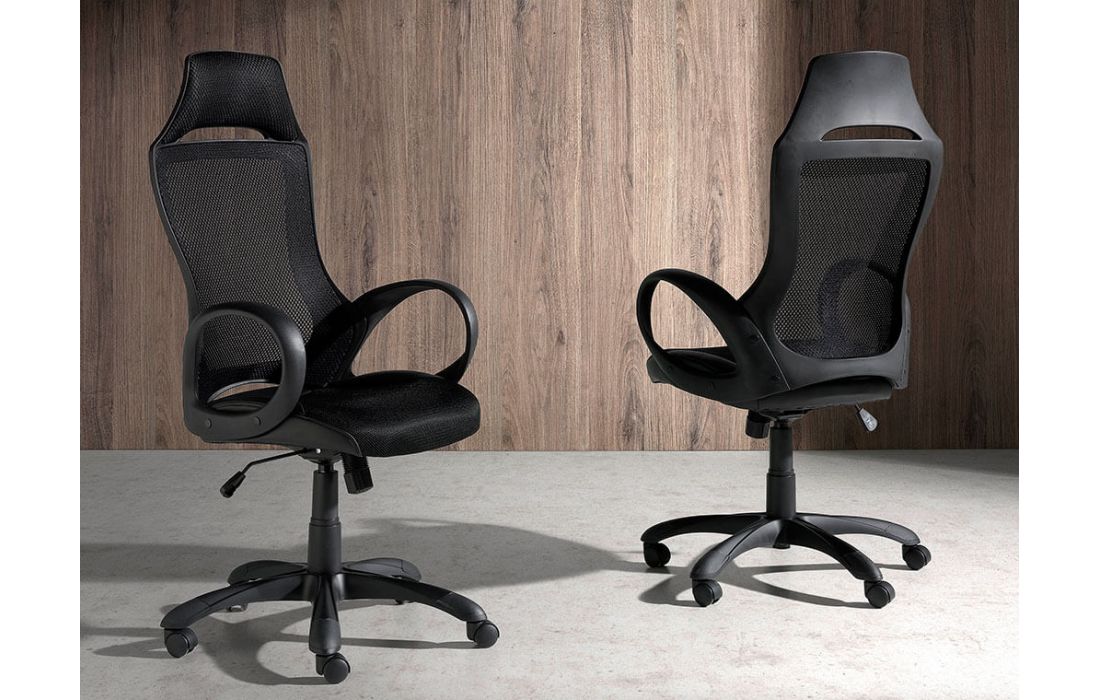 Cadeira de escritório giratória com braços estofada em tecido de malha preta. Sistema giratório 360º com mecanismo reclinável. Altura ajustável por alavanca com mecanismo de elevação hidráulico. Estrutura de pernas pretas com rodas.