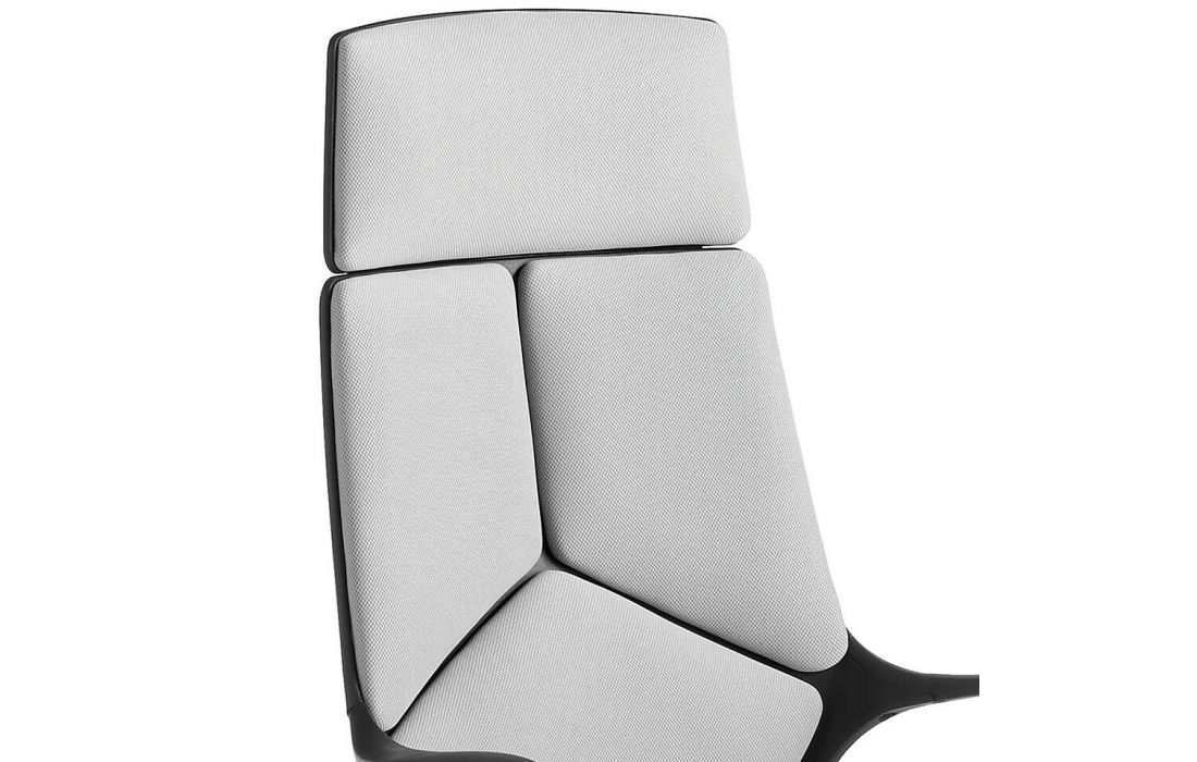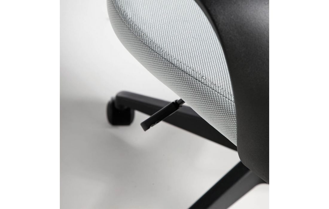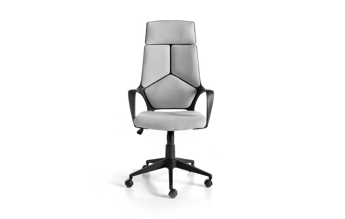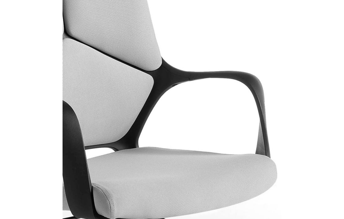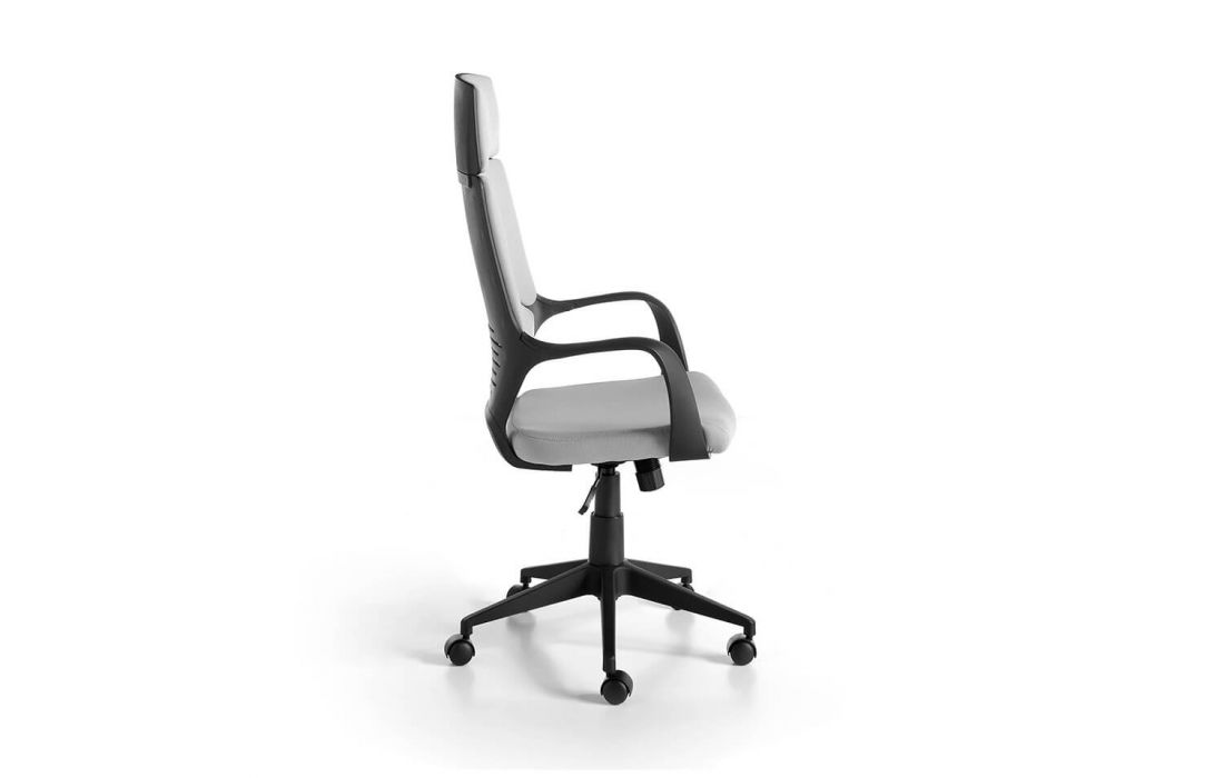Cadeira de escritório estofada em tecido cinza com braços. Sistema giratório 360º e mecanismo reclinável. Altura ajustável por alavanca com mecanismo de elevação hidráulico. Pernas pretas com rodas.