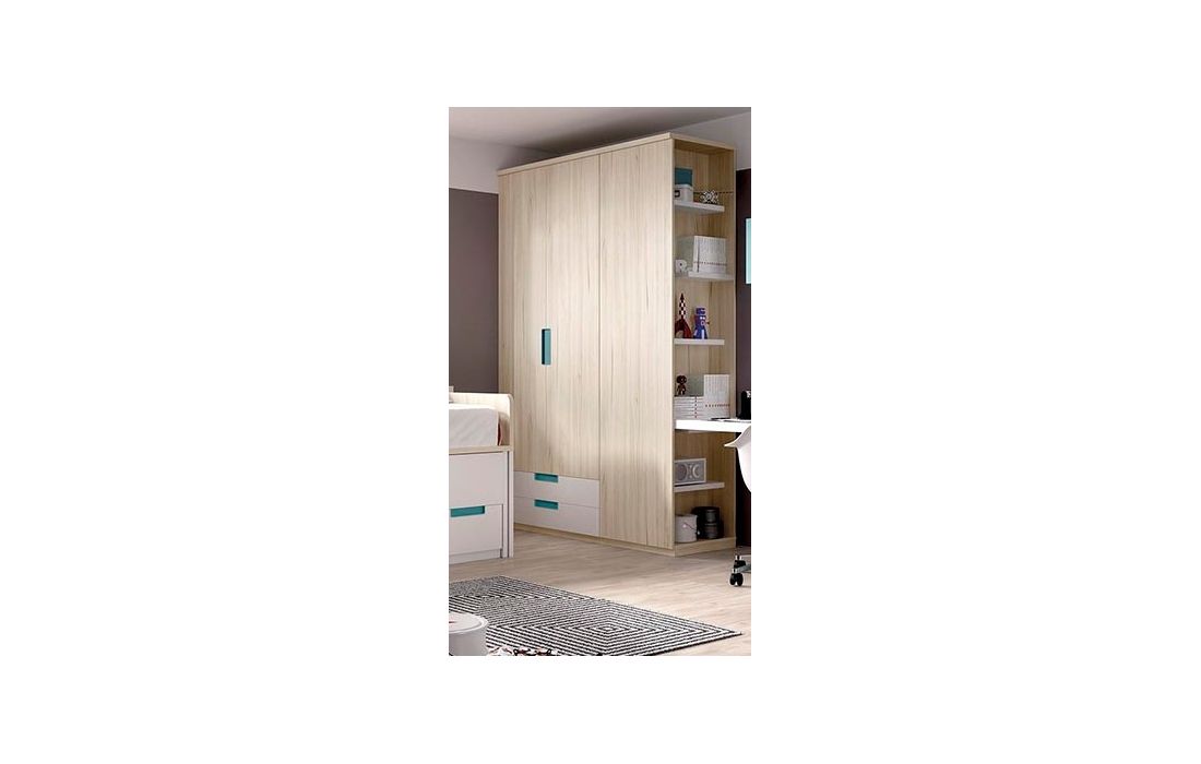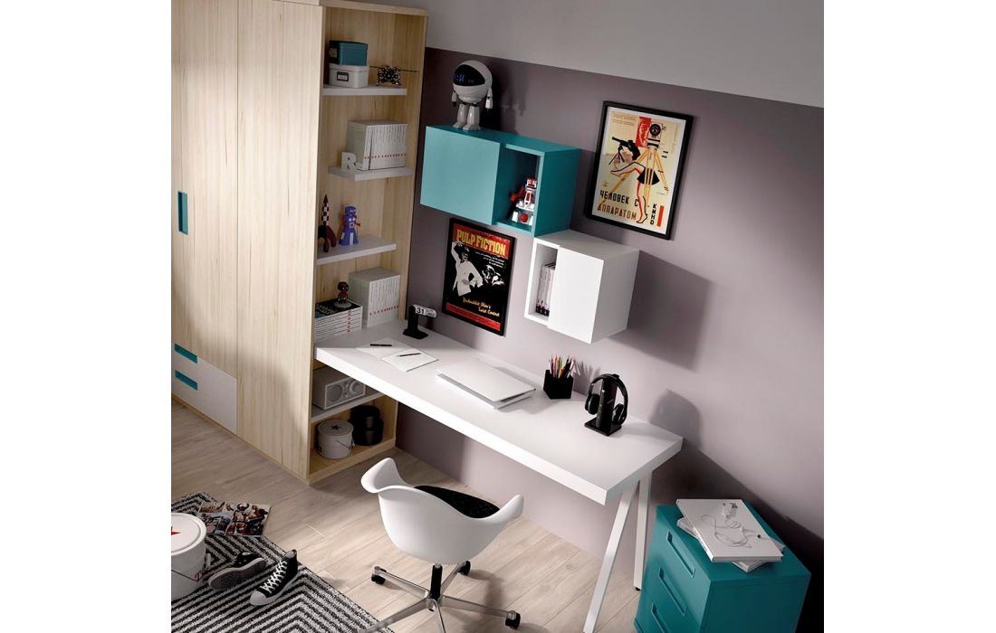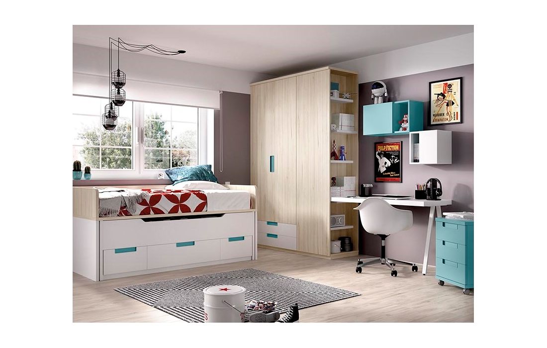 Roupeiro, Mesa de Cabeceira com rodas, Secratária, Compacto de 2 camas (c/ cama-gavetão) e 3 gavetas, Módulos de parede