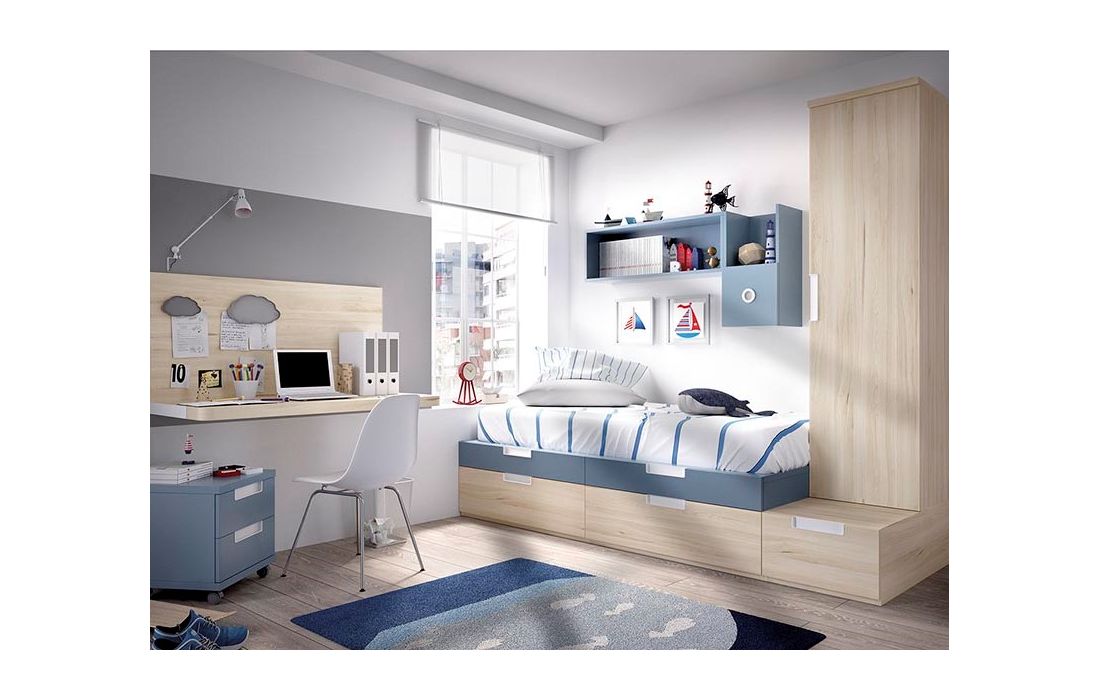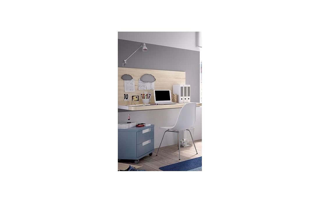Roupeiro, Secratária, Mesa de cabeceira com rodas, Compacto de cama com 5 gavetas, Módulos de parede