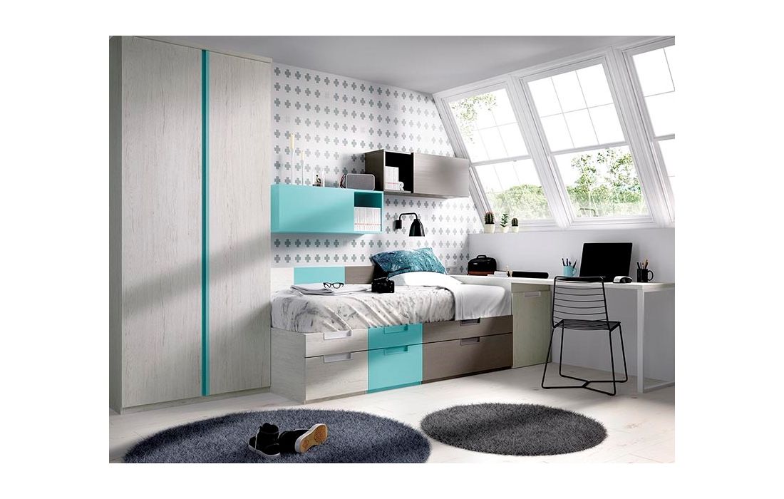Roupeiro, Secratária, Compacto de cama com 6 gavetas, Módulos de parede