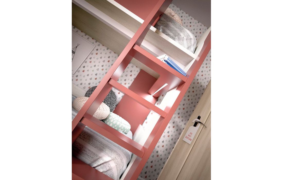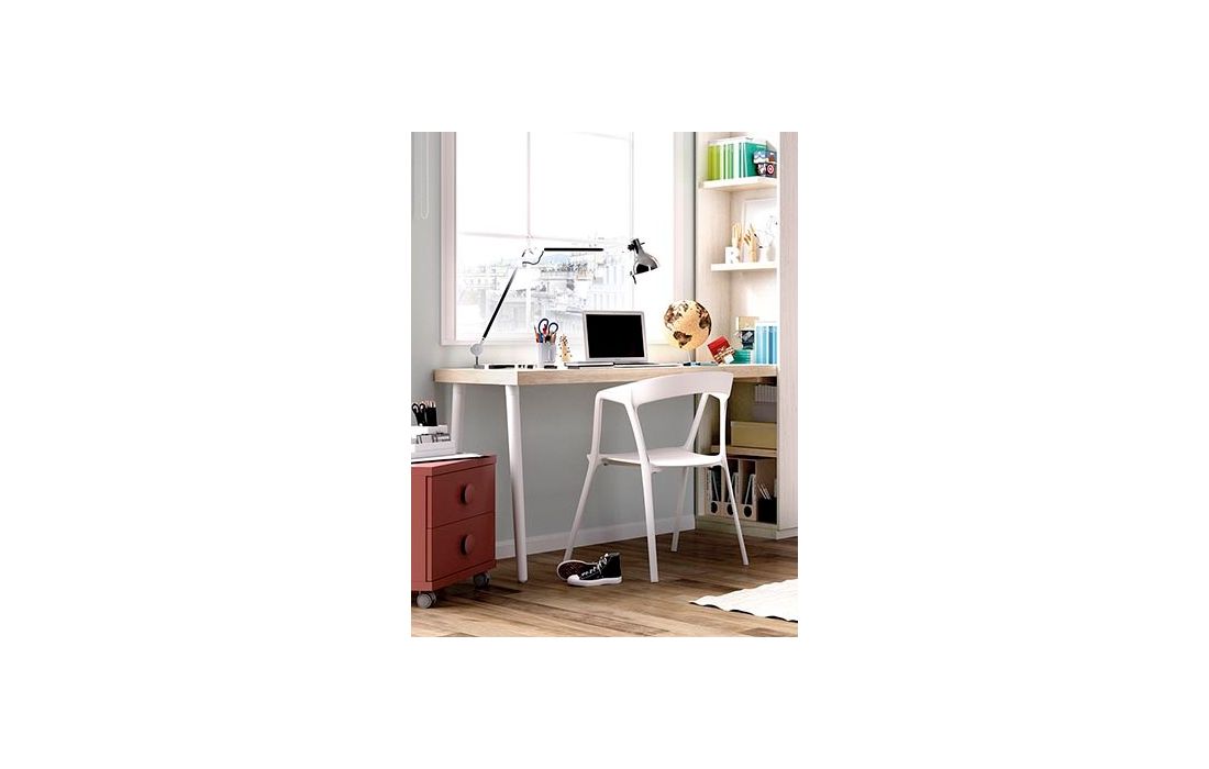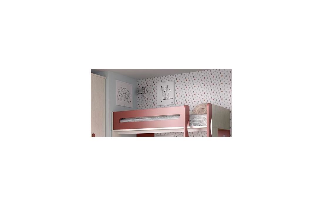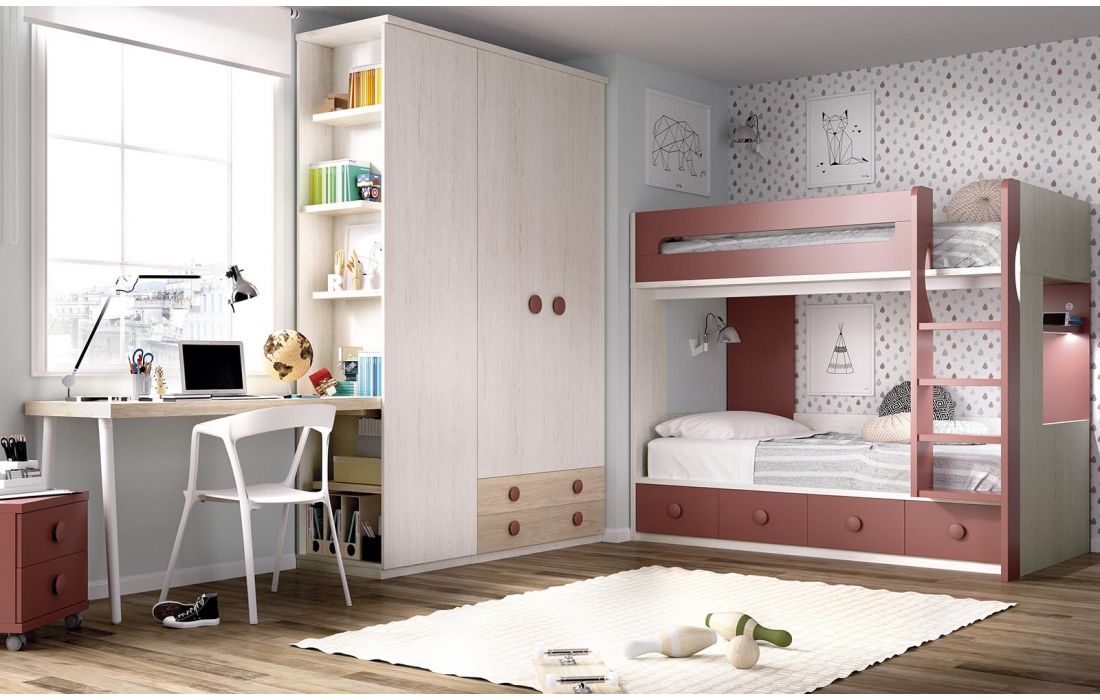 Beliche com 4 gavetas, Secretária, Roupeiro com Estante, Mesa de Cabeceira com rodas, Módulos de parede