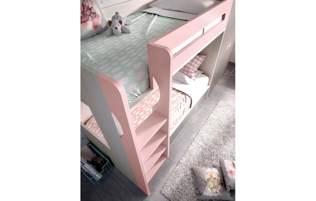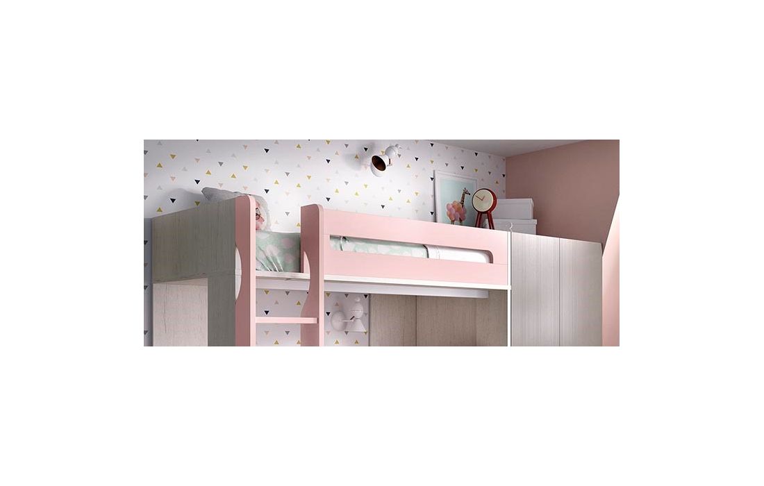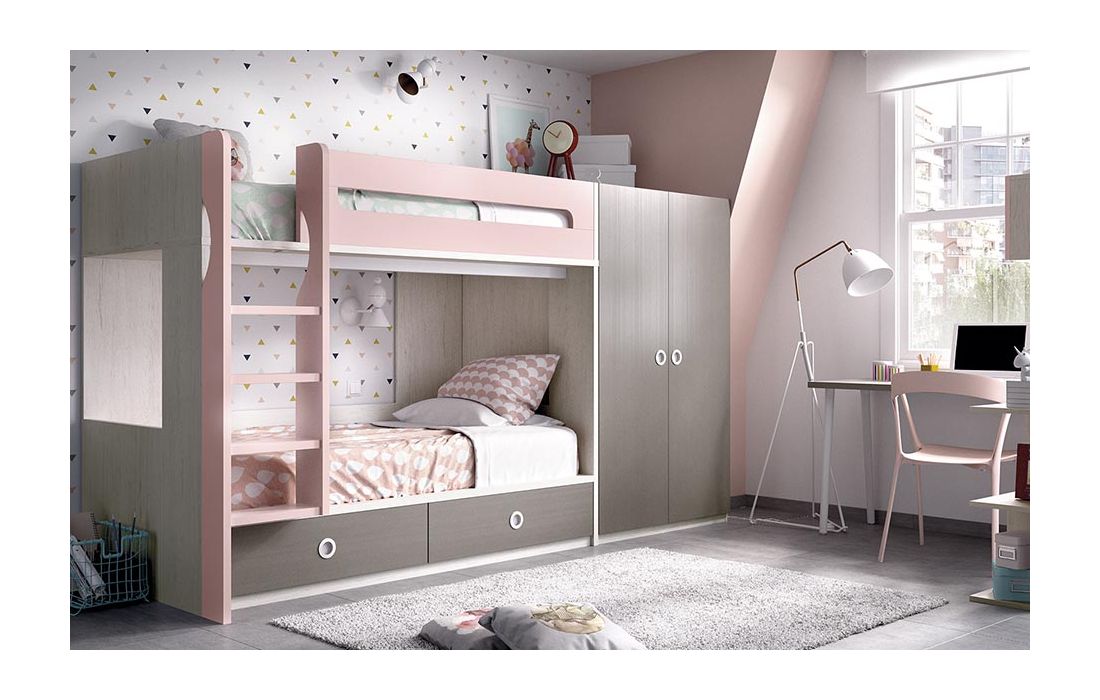 Beliche com 2 gavetas, Secretária com estante, Roupeiro, Módulos de parede