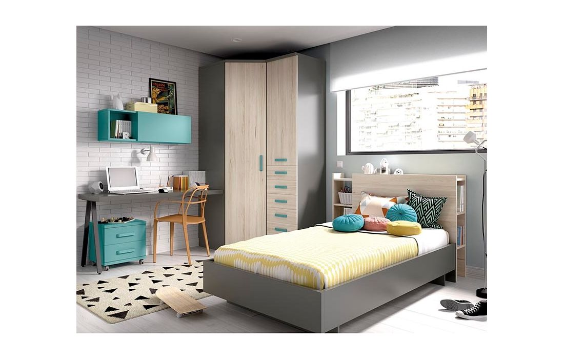 Cama, Secratária, Mesa de Cabeceira com Rodas, Roupeiro, Módulos de Parede