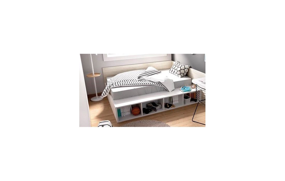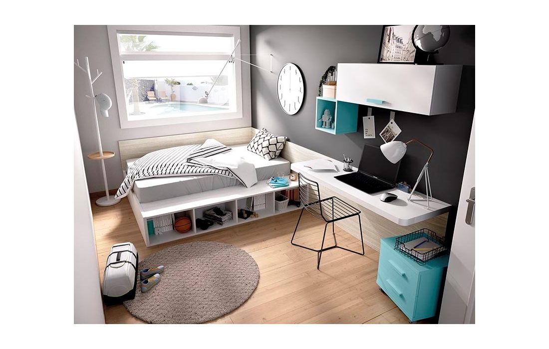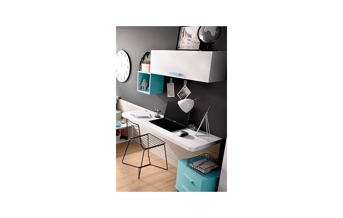 Cama c/ Estante, Secretária, Mesa de Cabeceira c/ Rodas, Módulos de Parede