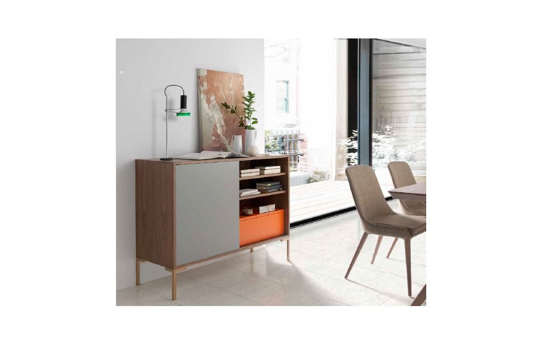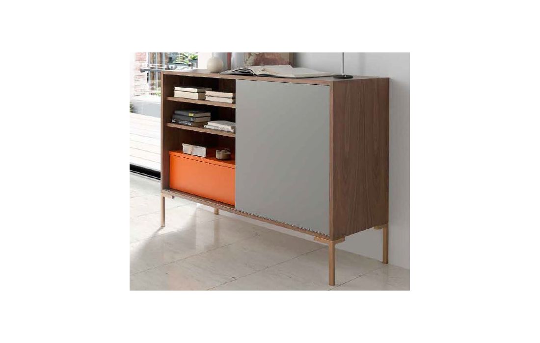 Móvel alto com 1 porta de correr 2 gavetas e 4 prateleiras, estrutura em nogueira com acabamento em laranja e taupe, pés em metal cobre.