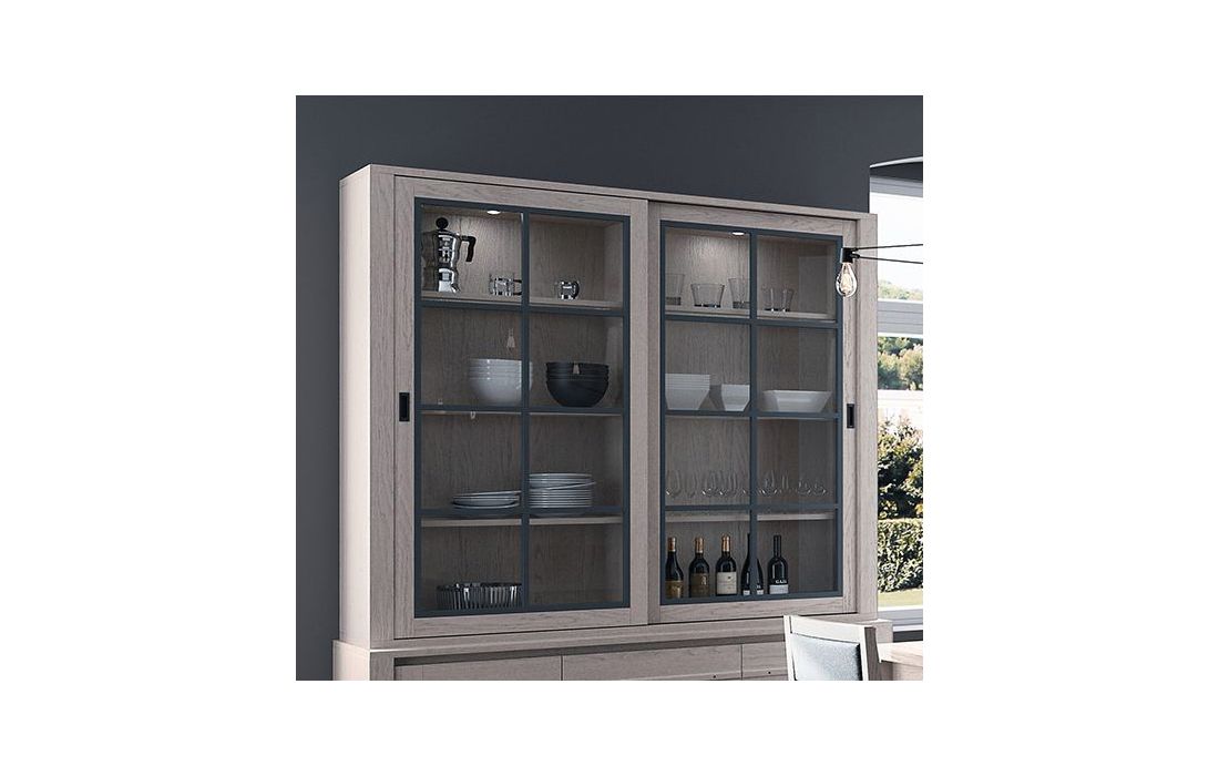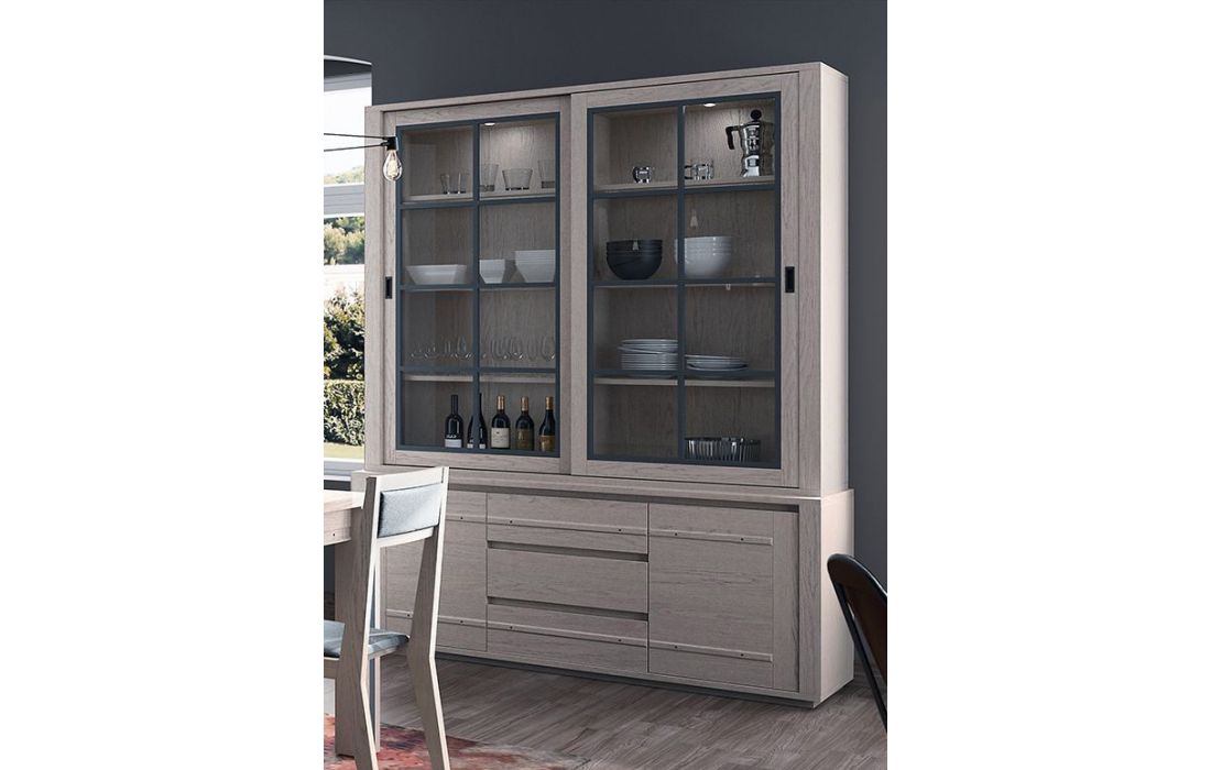Móvel alto com 2 portas de correr em vidro, 3 gavetas e 2 portas de madeira, nos vários acabamentos possiveis.