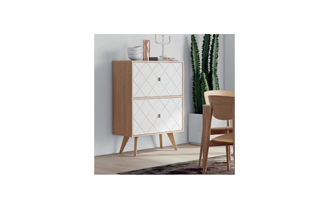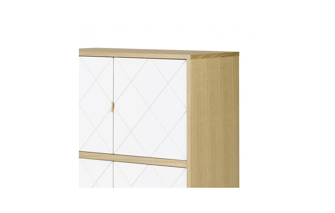 Móvel alto com detalhes diferenciados, como o padrão geométrico das portas ou a sofisticação dos puxadores em pele natural.