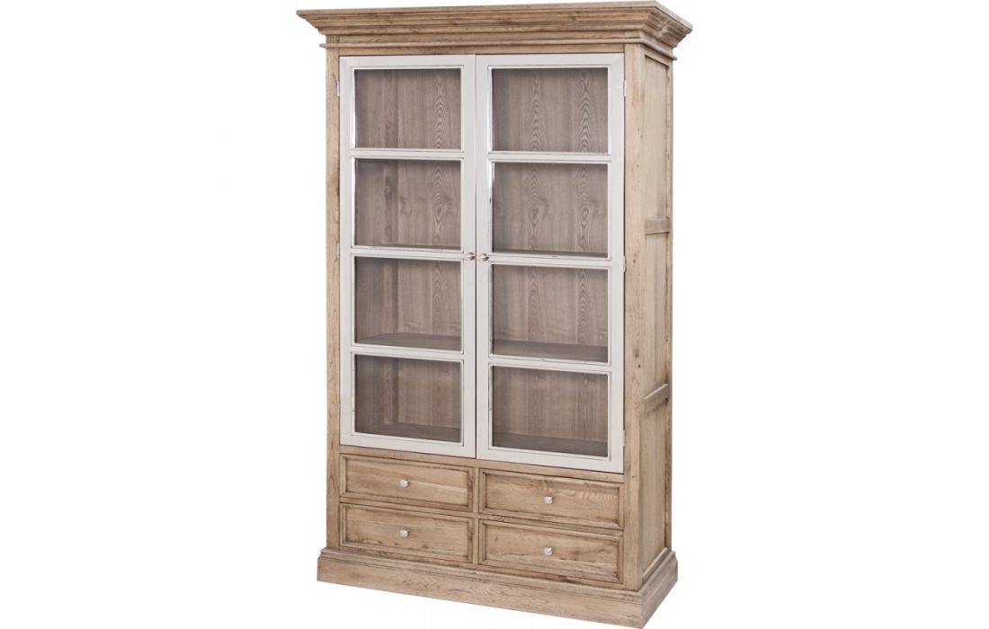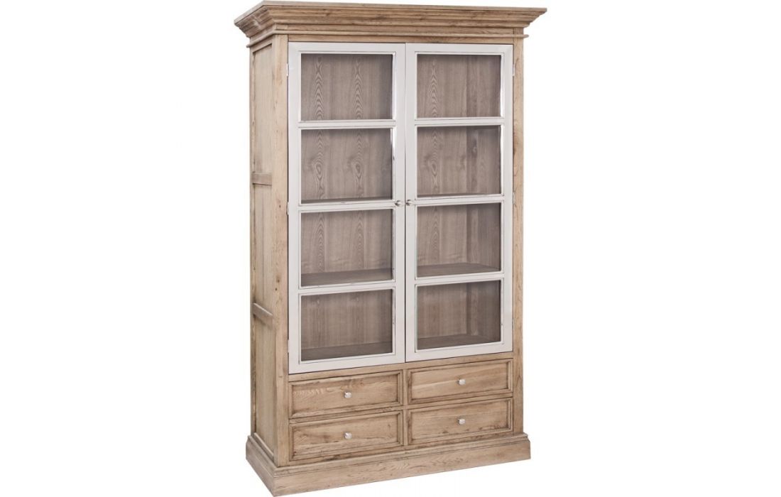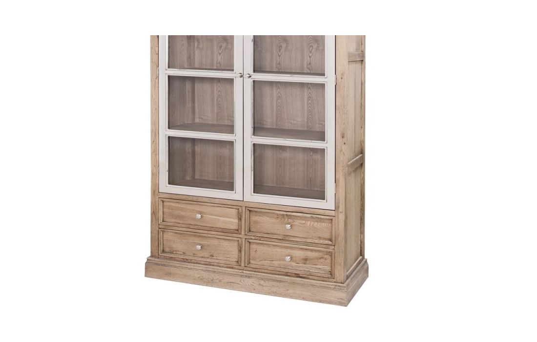 Móvel alto em madeira de carvalho e frentes em vidro e metal.