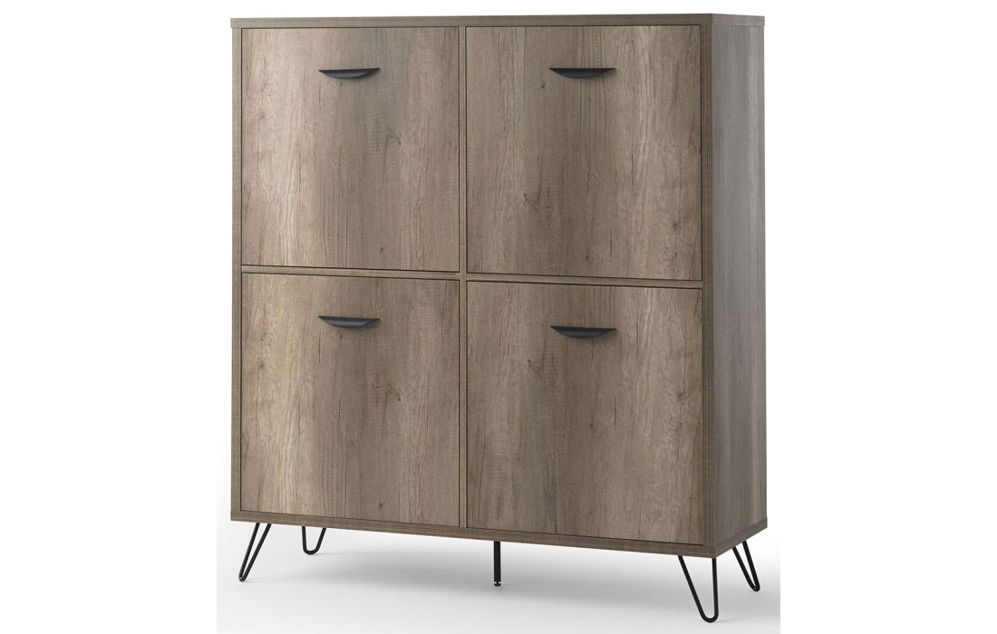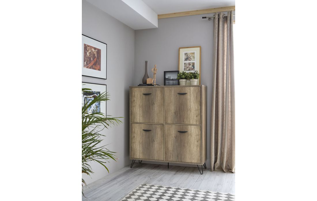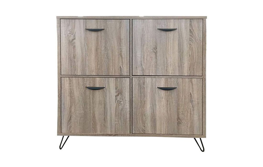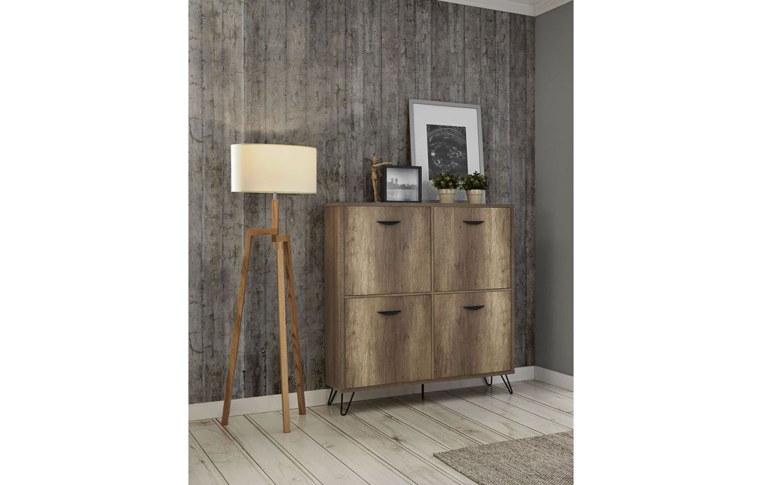 Móvel alto em melanina de nogueira com pés em metal pintado preto.