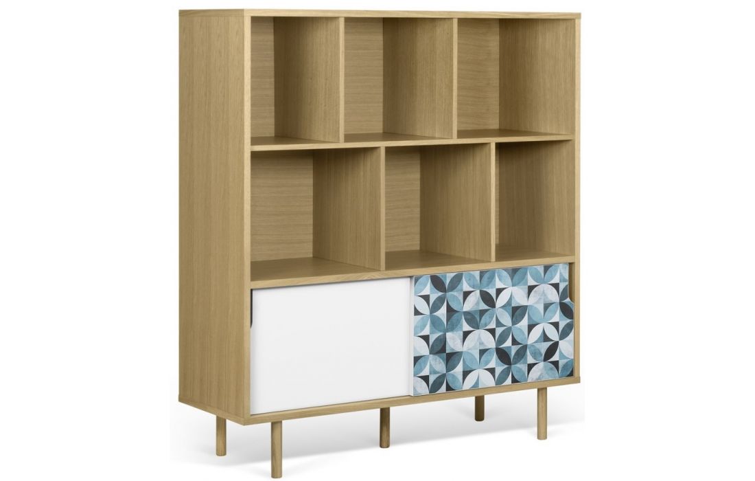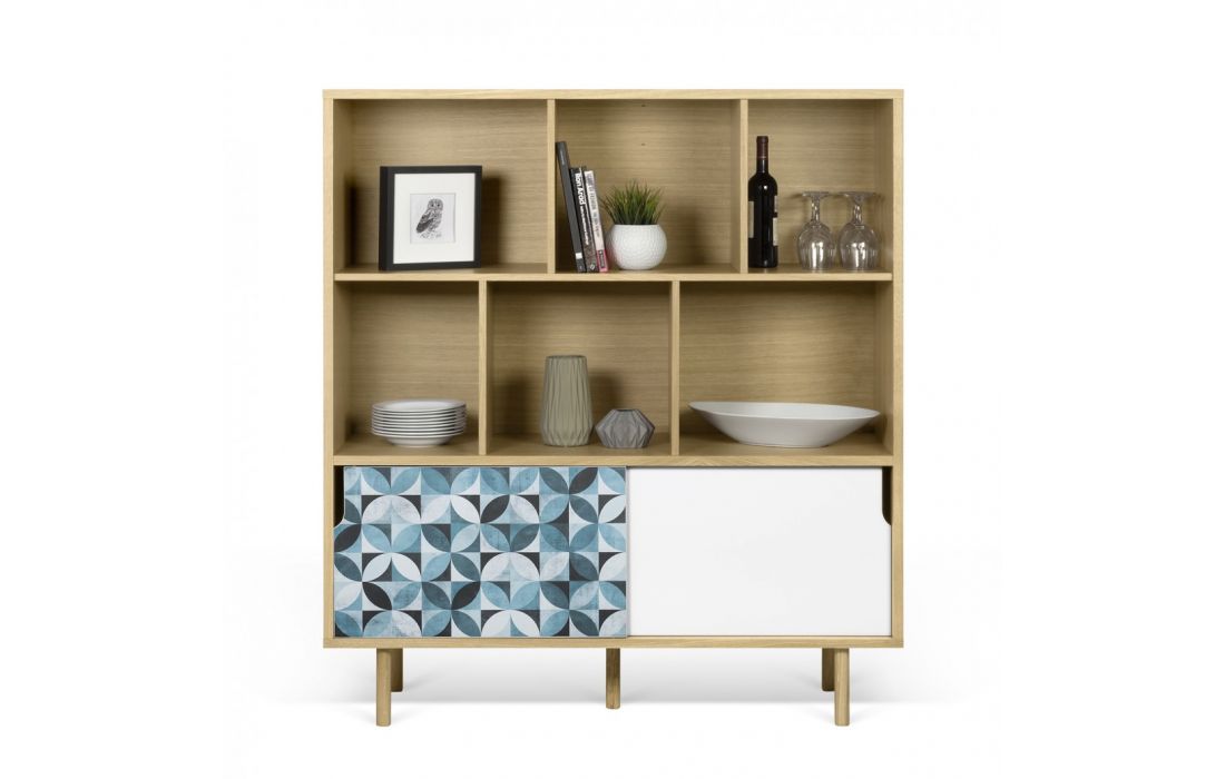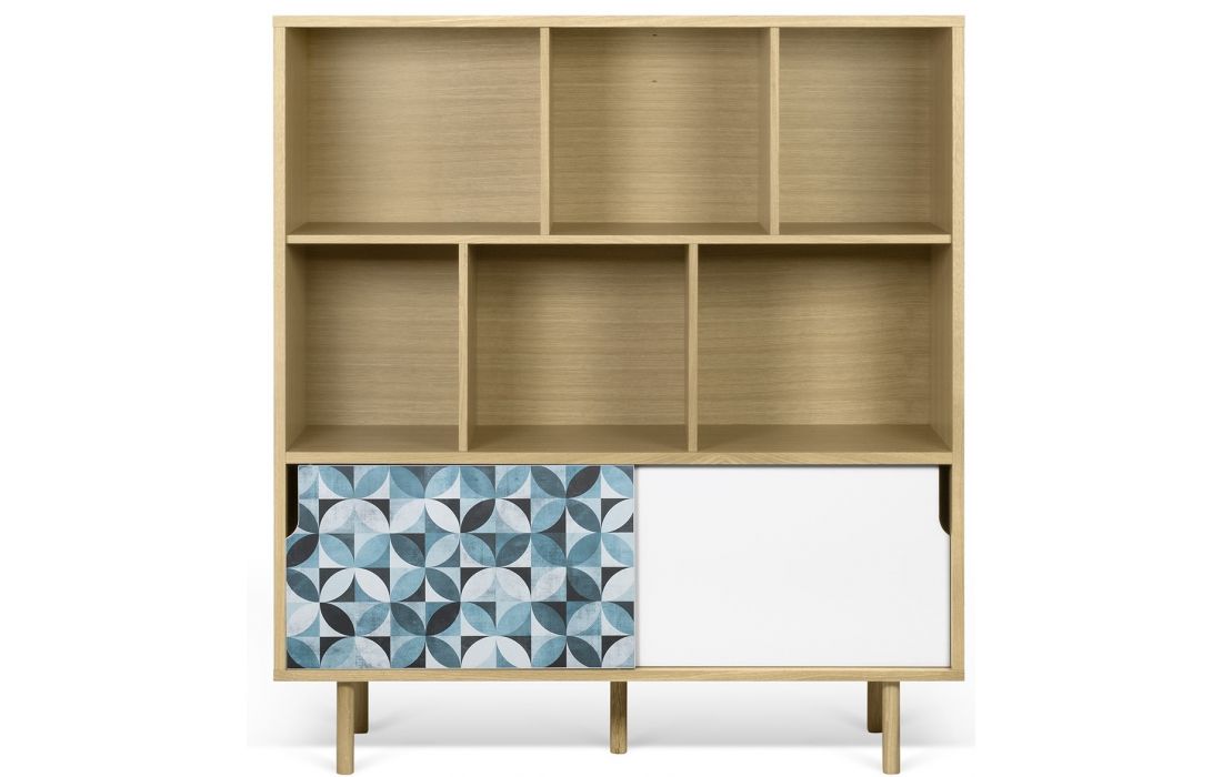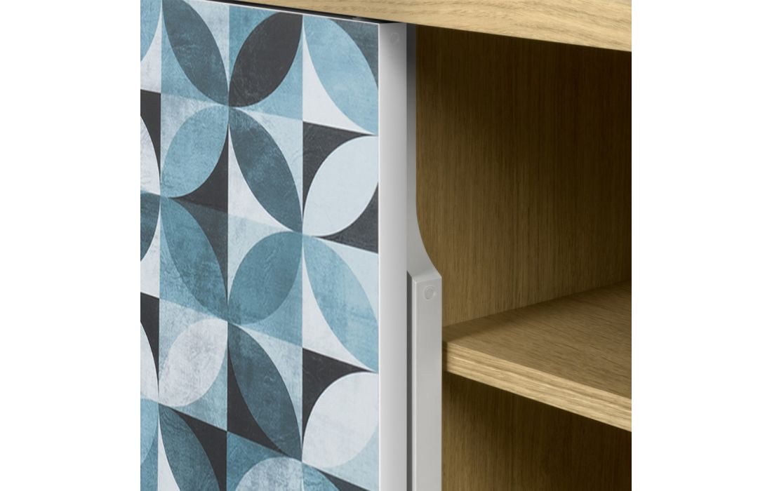 Móvel alto com detalhes diferenciadores, como o padrão geométrico nas portas.