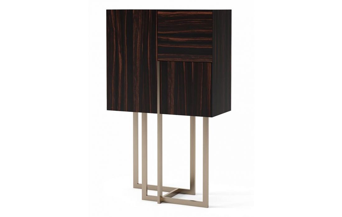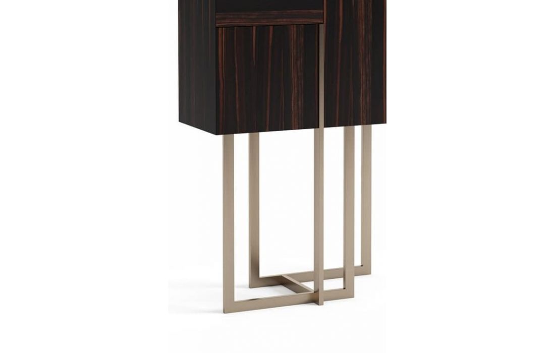 Móvel alto Licoreiro folheado a ébano, c/ pelo pé em inox dourado mate. Interior com espelho na costa e prateleiras de vidro.