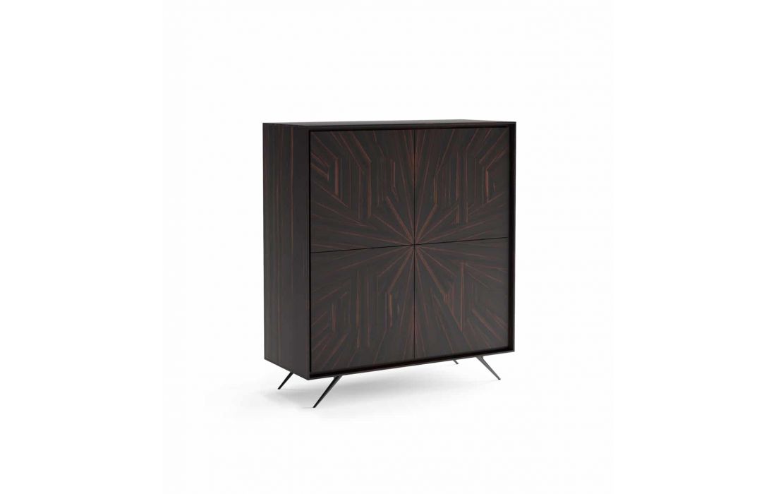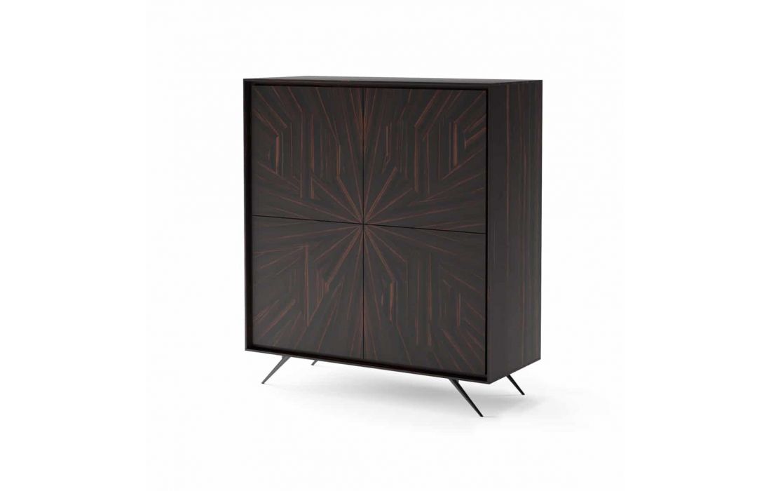 Móvel alto licoreiro com estrutura MDF folheada a ébano, inserção de naipes nas portas e pés em ferro preto. Interior com espelho na costa e prateleiras de vidro.