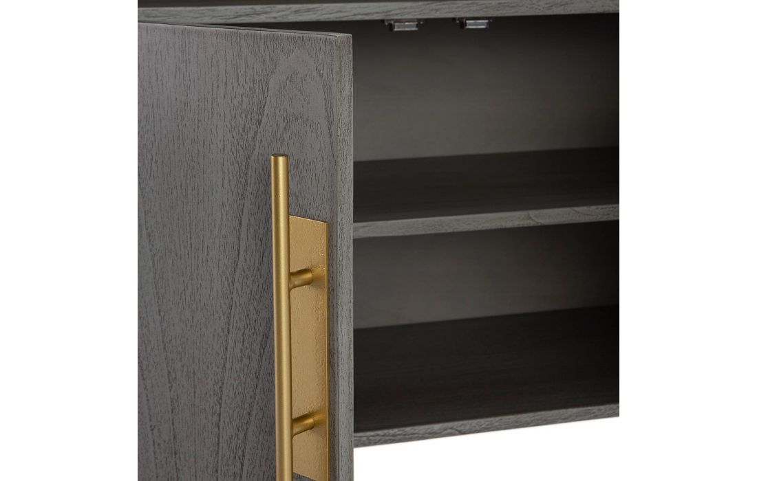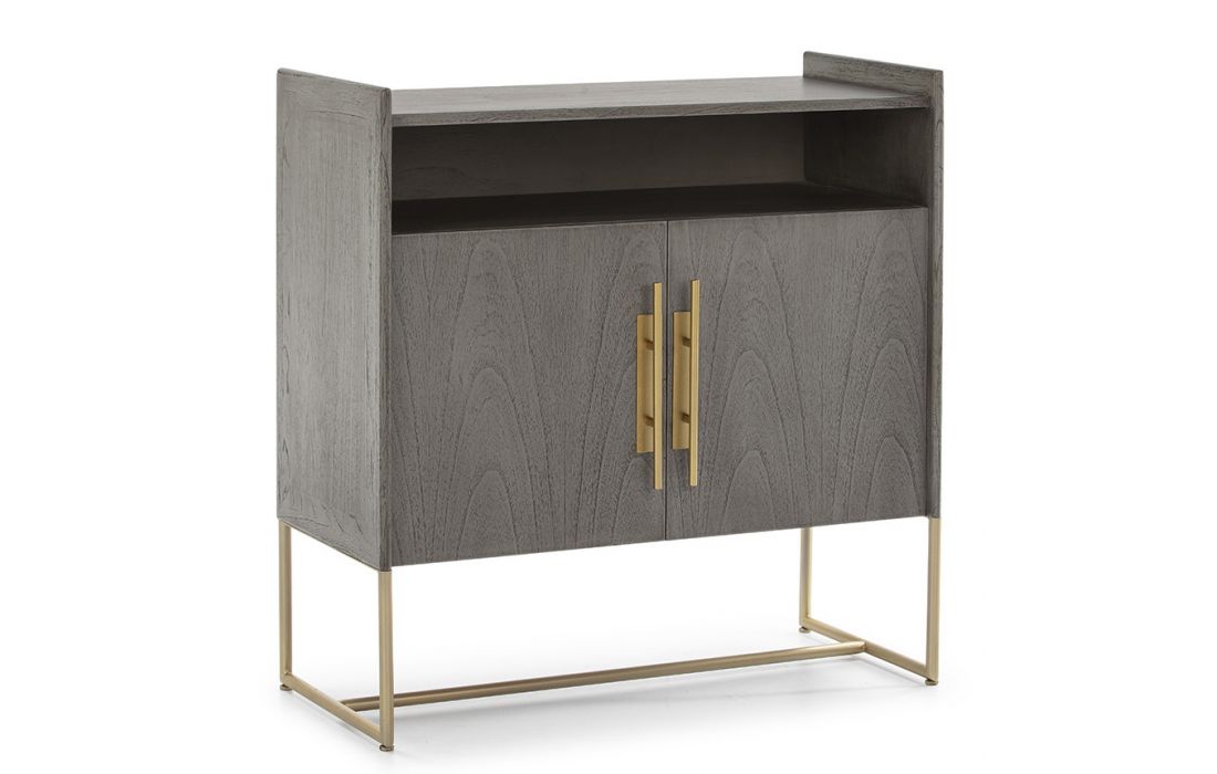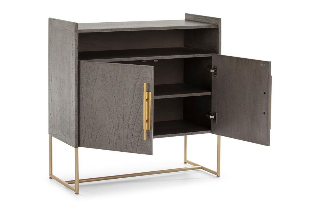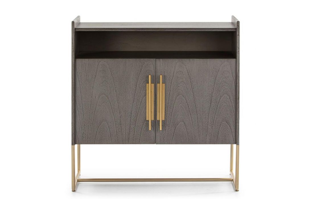 Móvel Alto de 2 portas com base e puchadores em metal dourado e estrutura em madeira de cedro cor cinza.