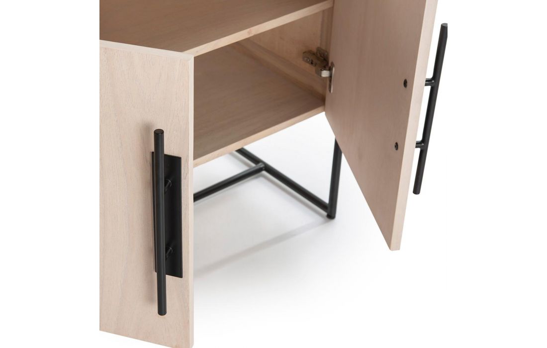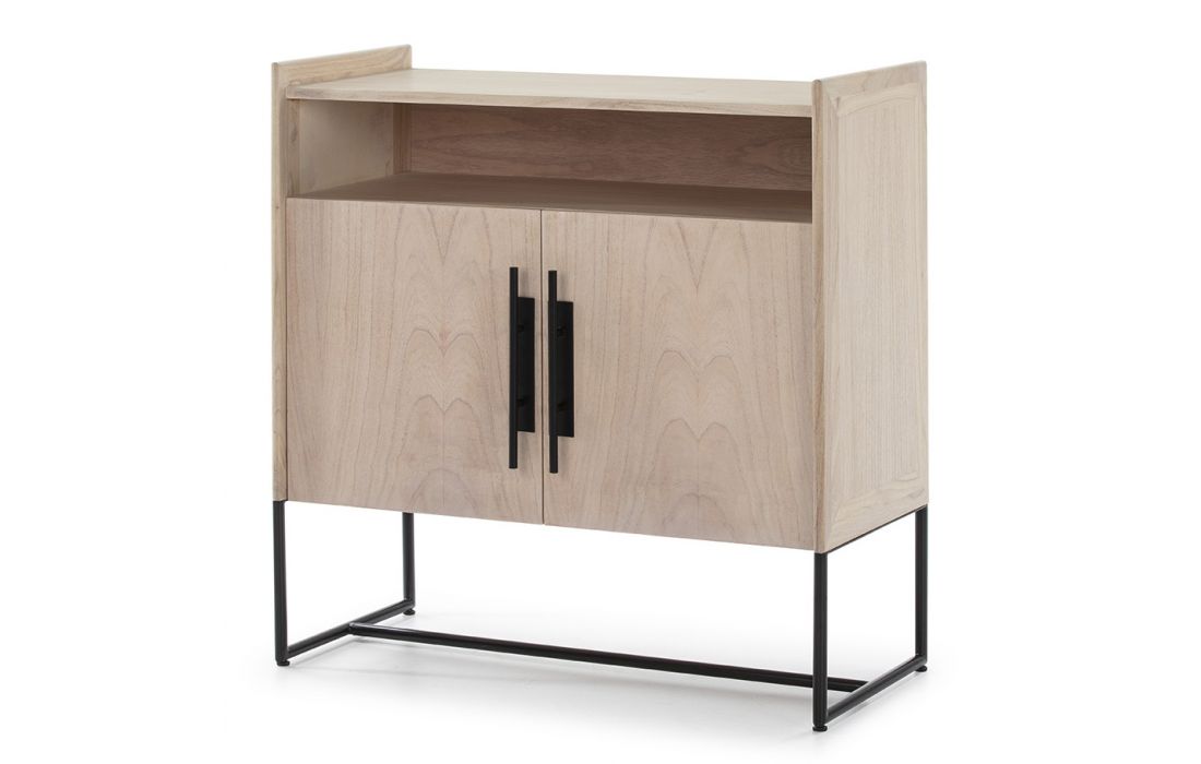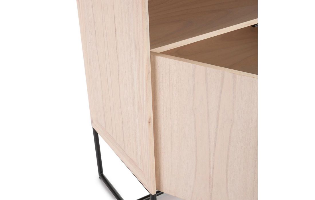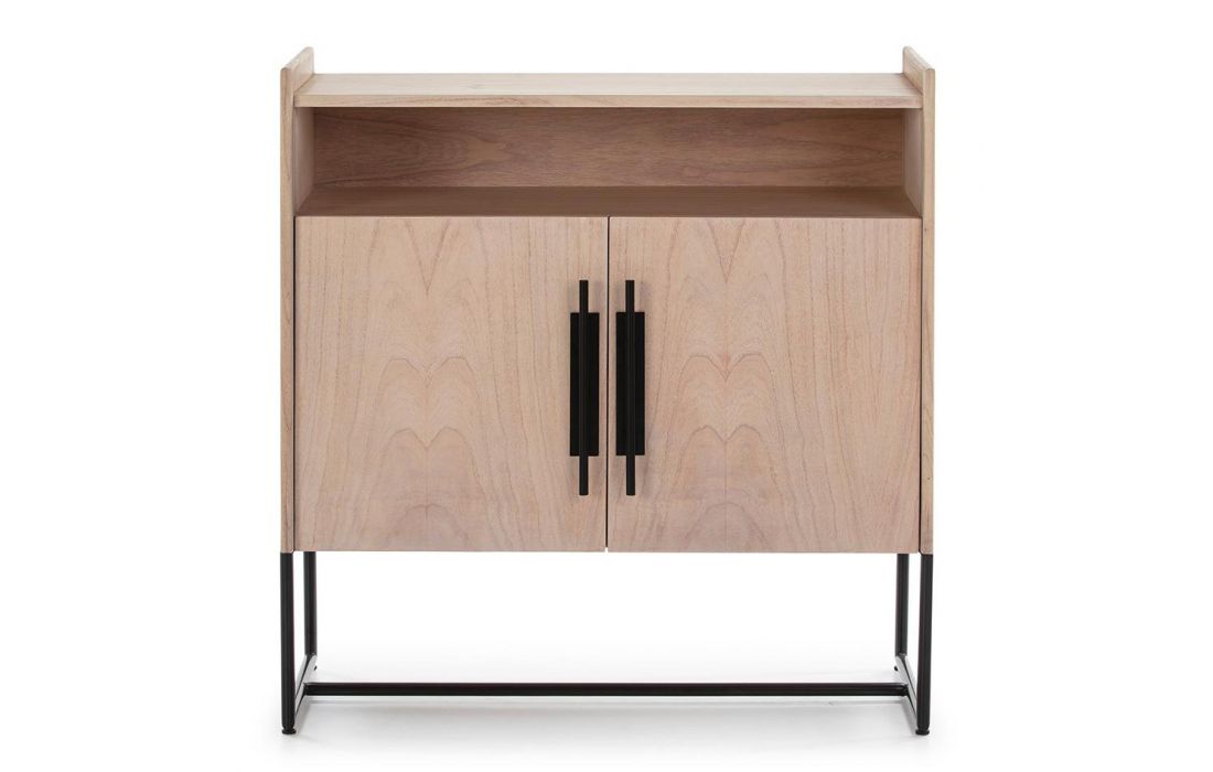 Móvel Alto de 2 portas com base e puchadores em metal preto e estrutura em madeira de cedro cor natural.