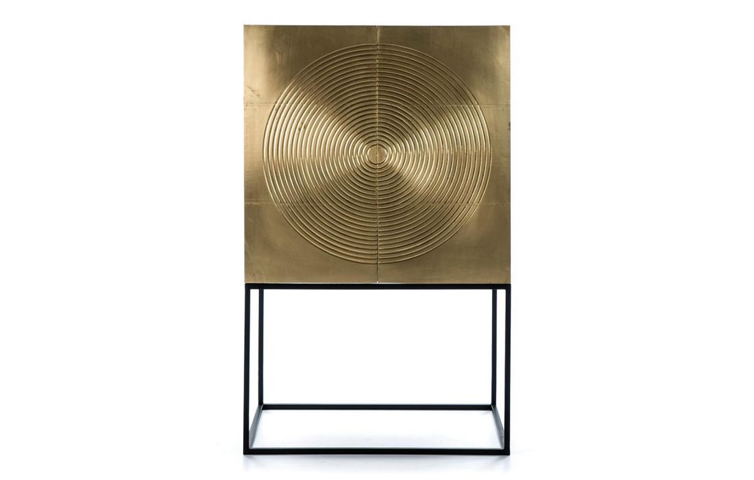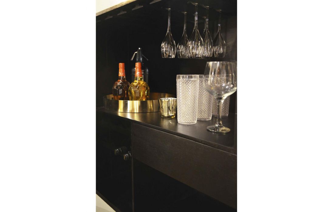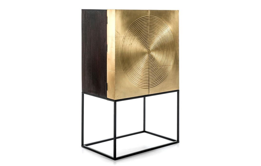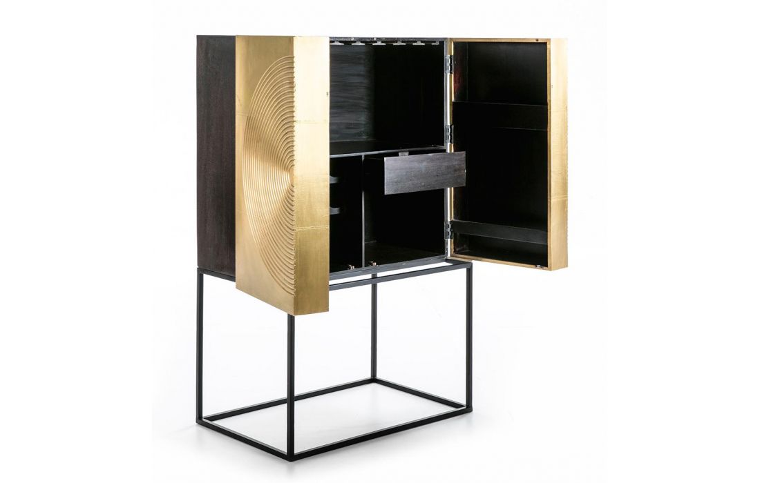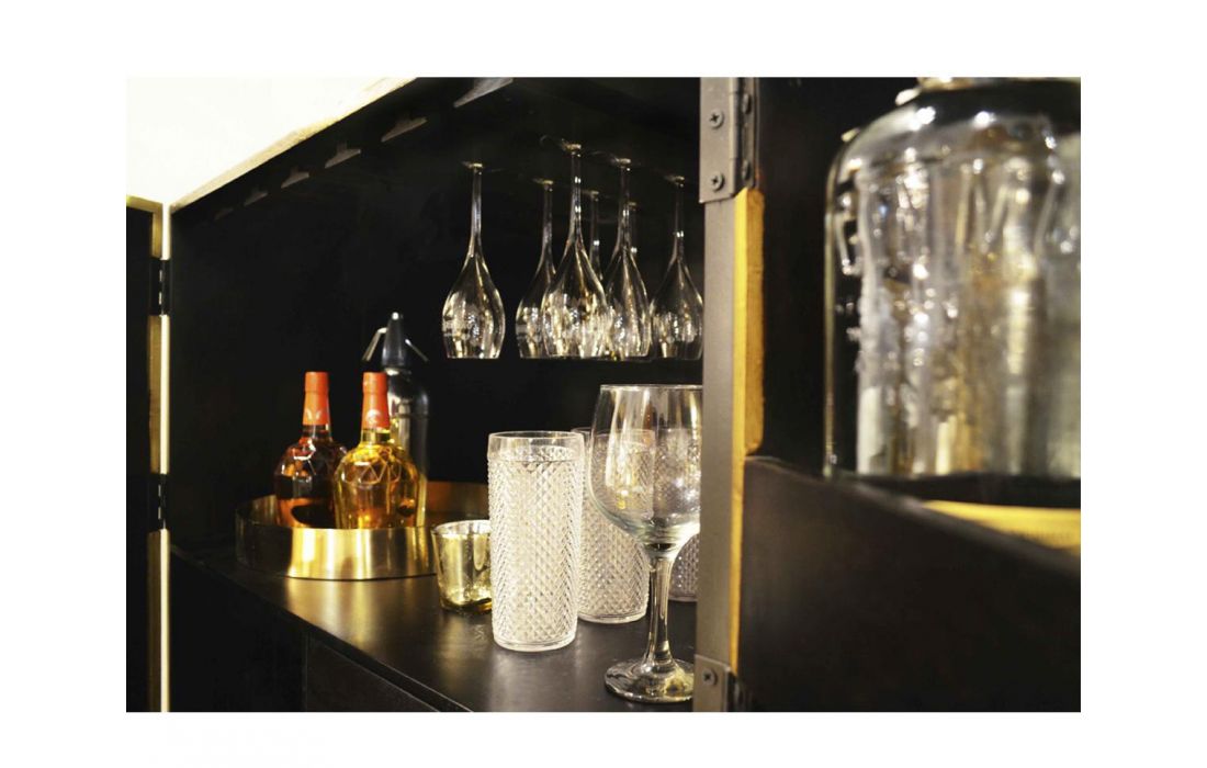 Móvel Alto bar de madeira cor preto/dourado e base em metal preto.