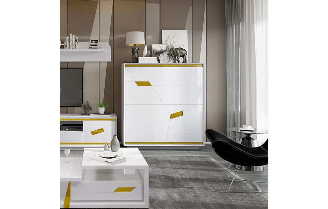 Acabamento igual à imagem: Lacado branco mate com pormenores em dourado