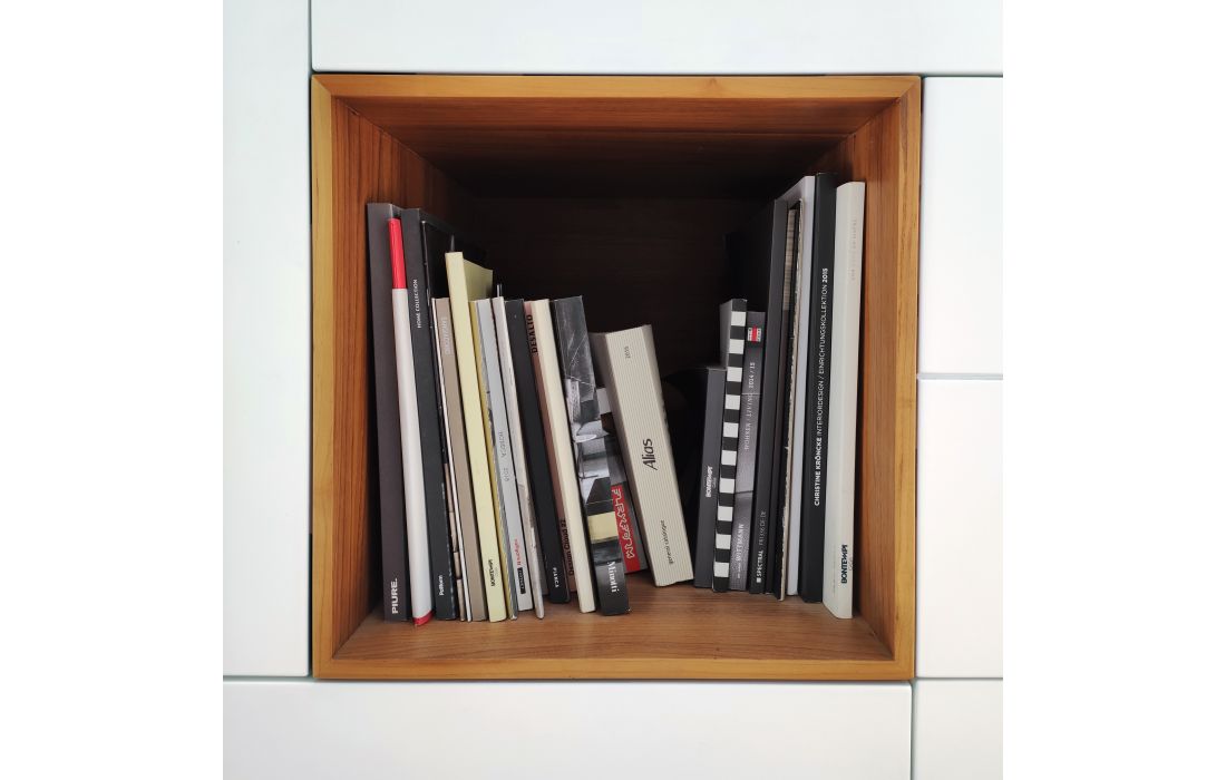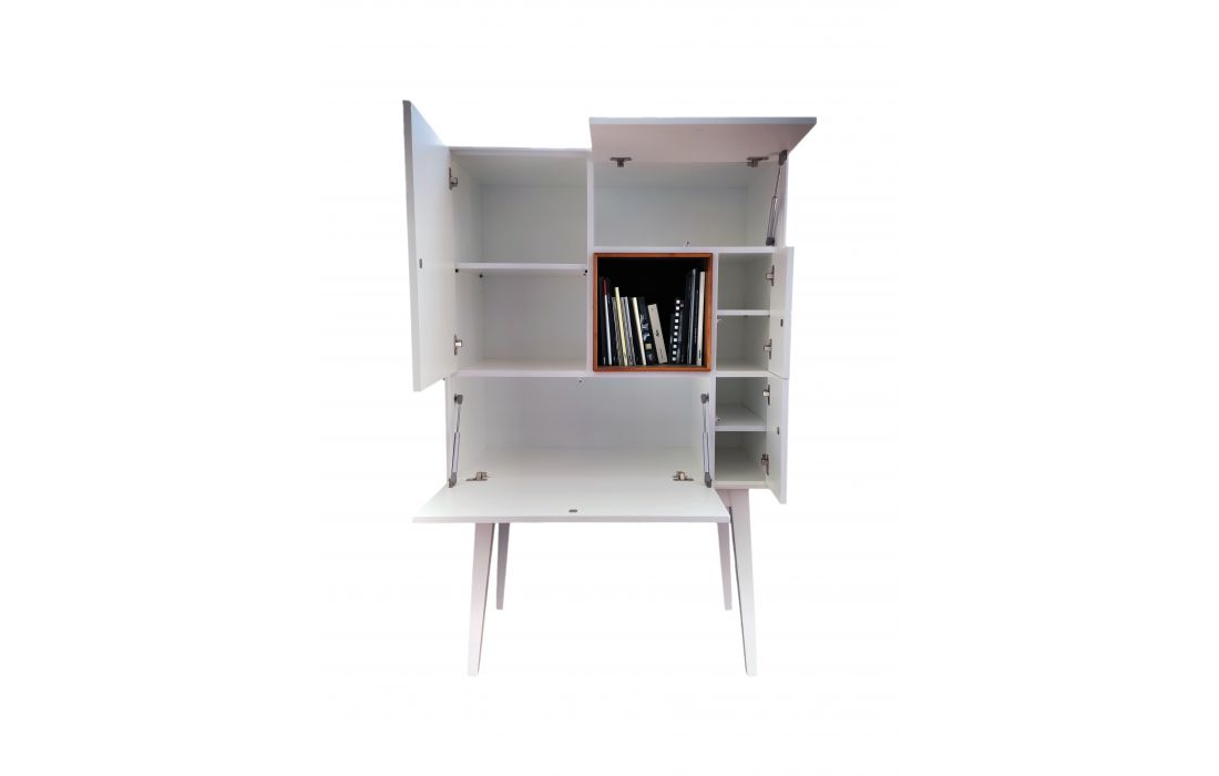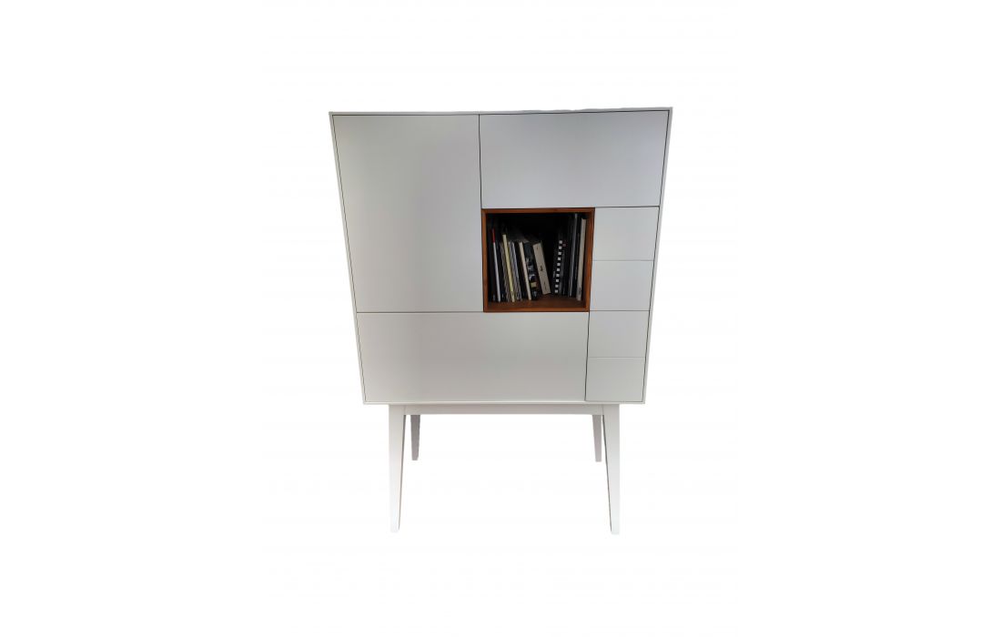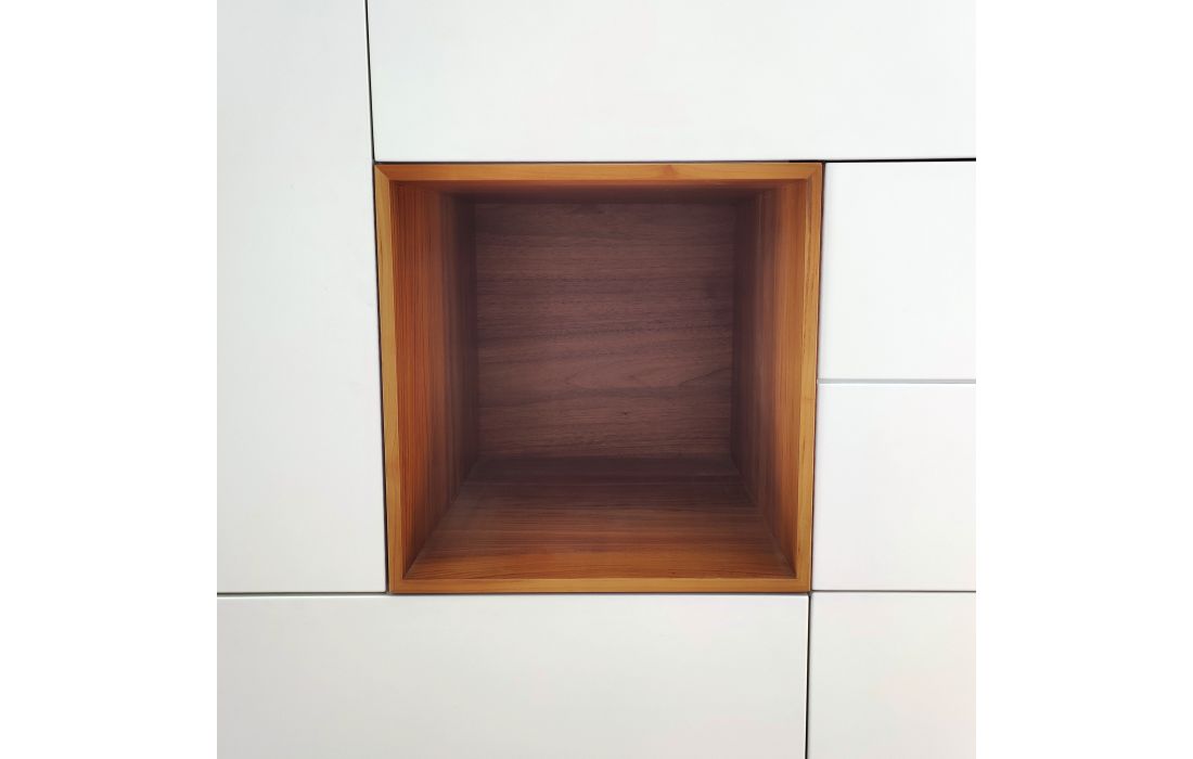 Acabamento igual à imagem: Lacado branco mate com pormenores em nogueira