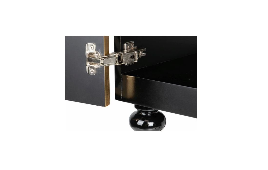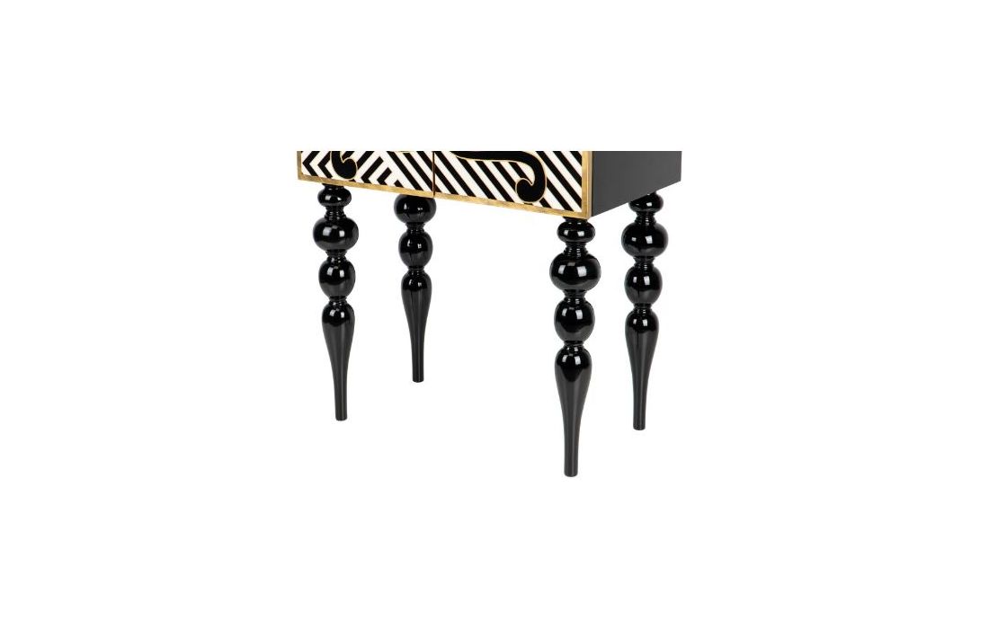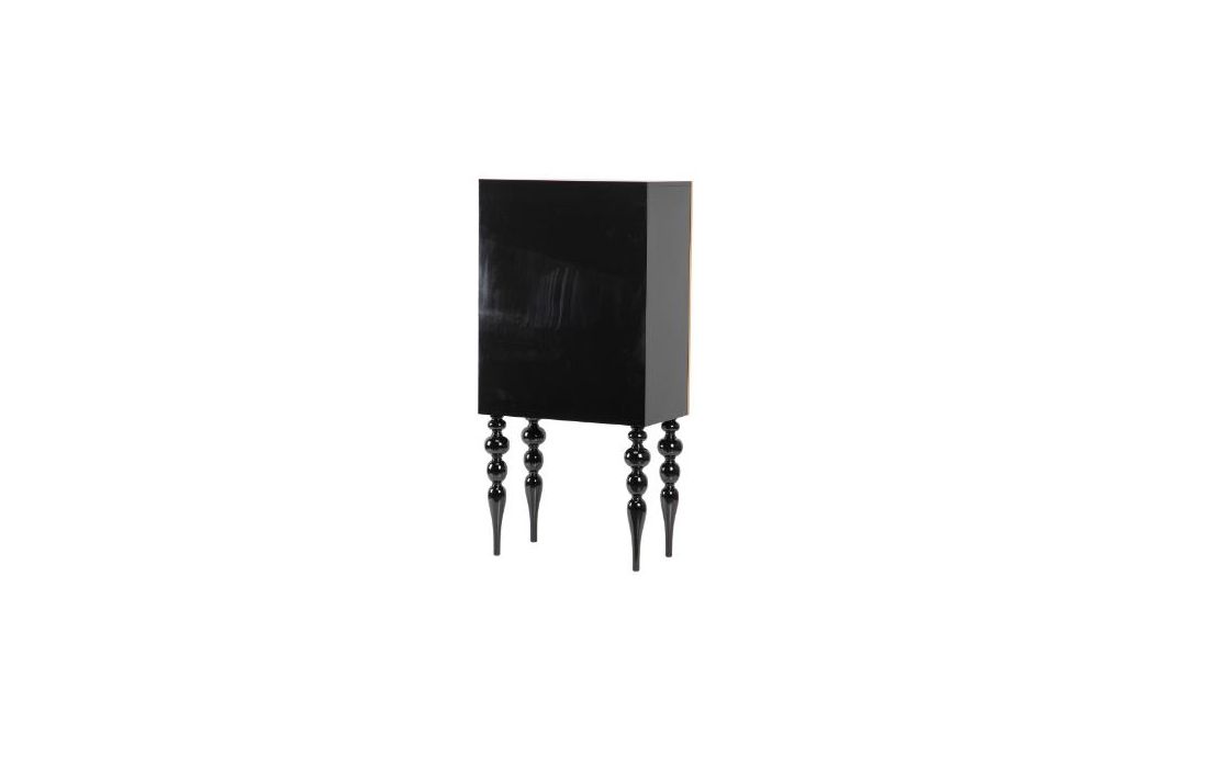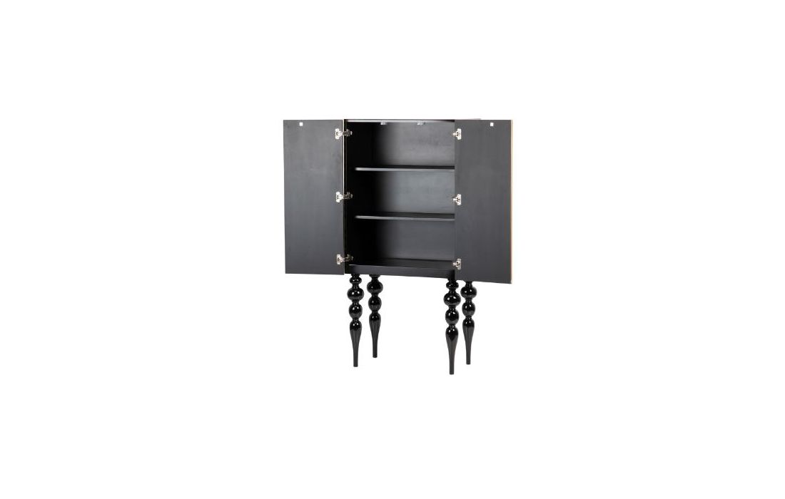 Móvel alto feito em madeira de bécula , com 2 portas pintado a branco e preto , com os pés em preto .