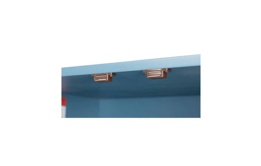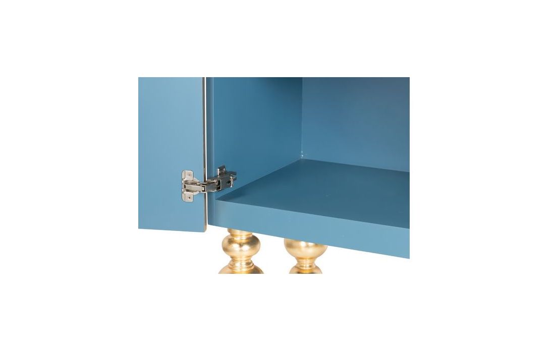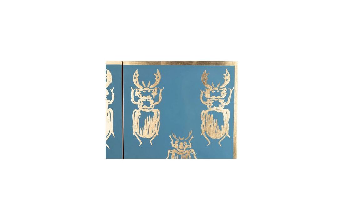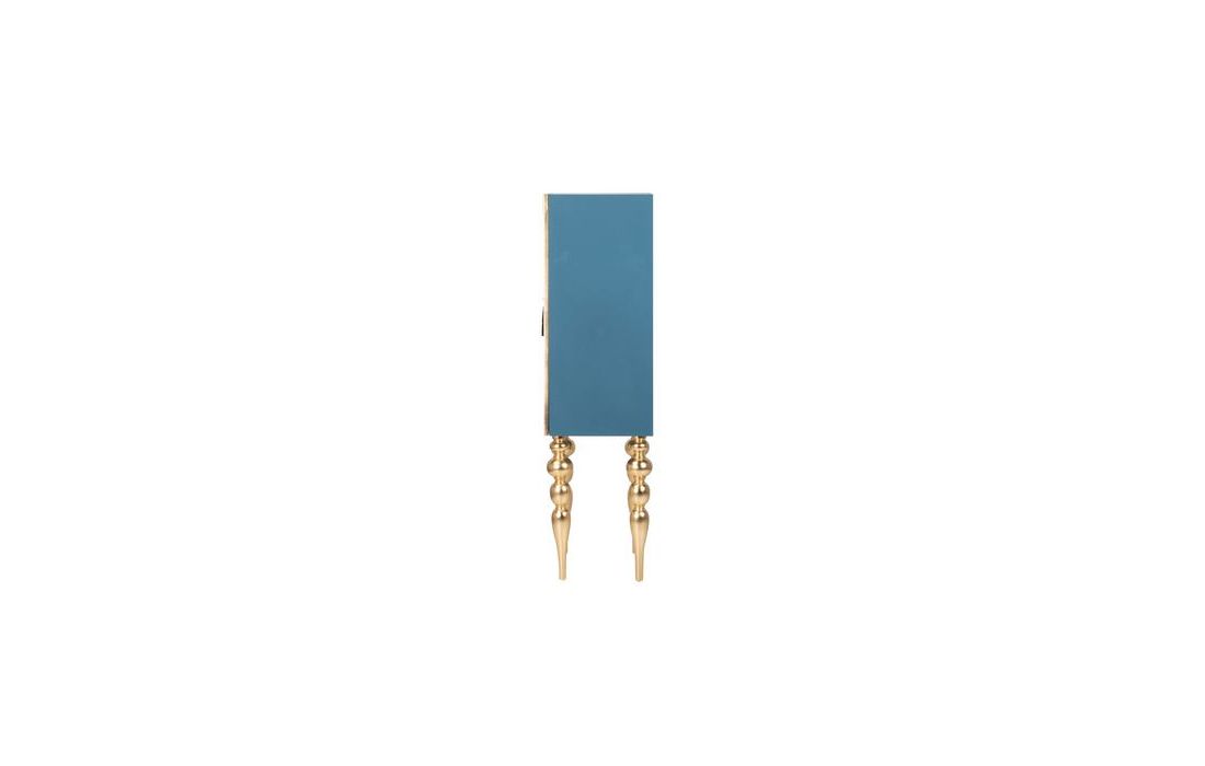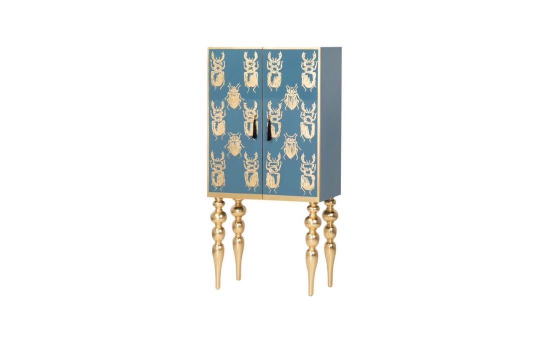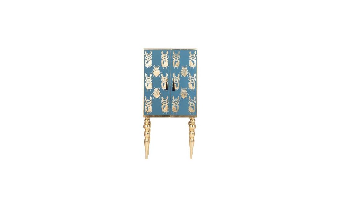 Móvel alto feito em madeira de bécula , com 2 portas pintado a azul e preto com detalhes dourados com os pés em dourado.