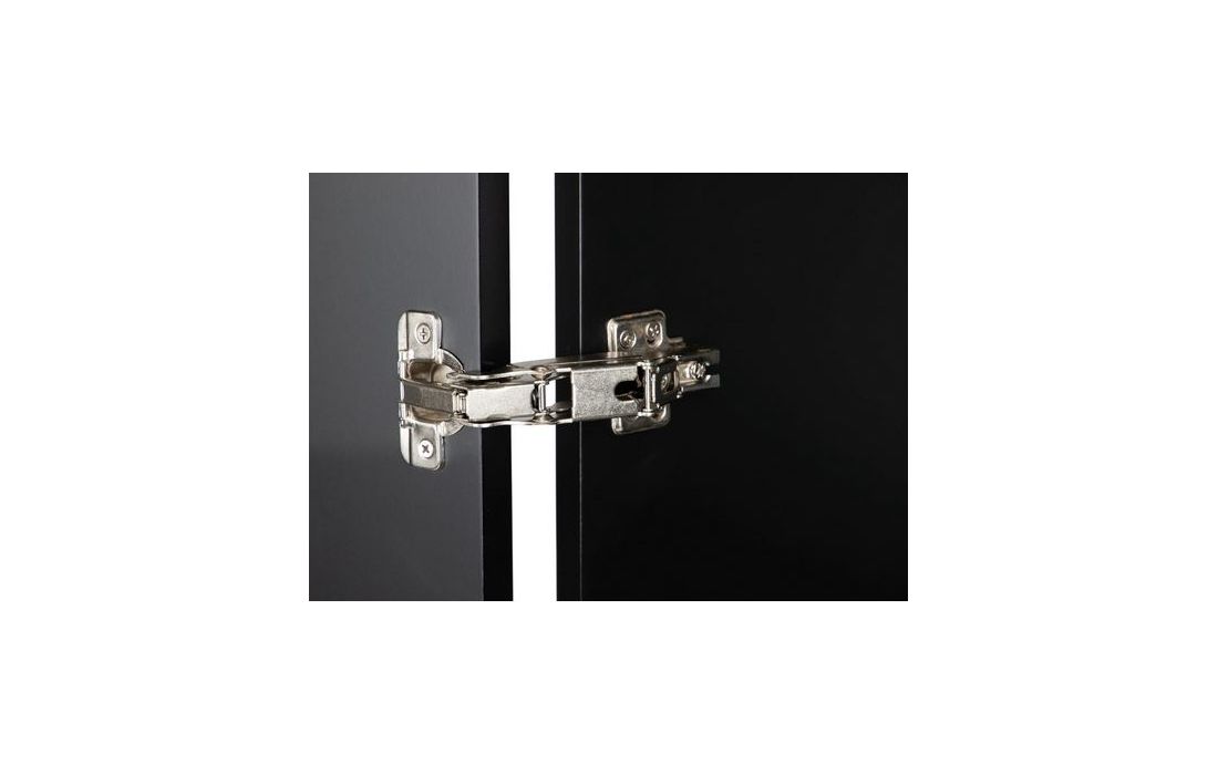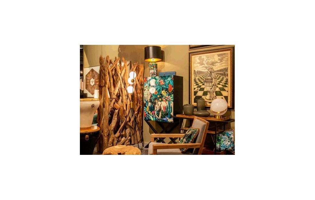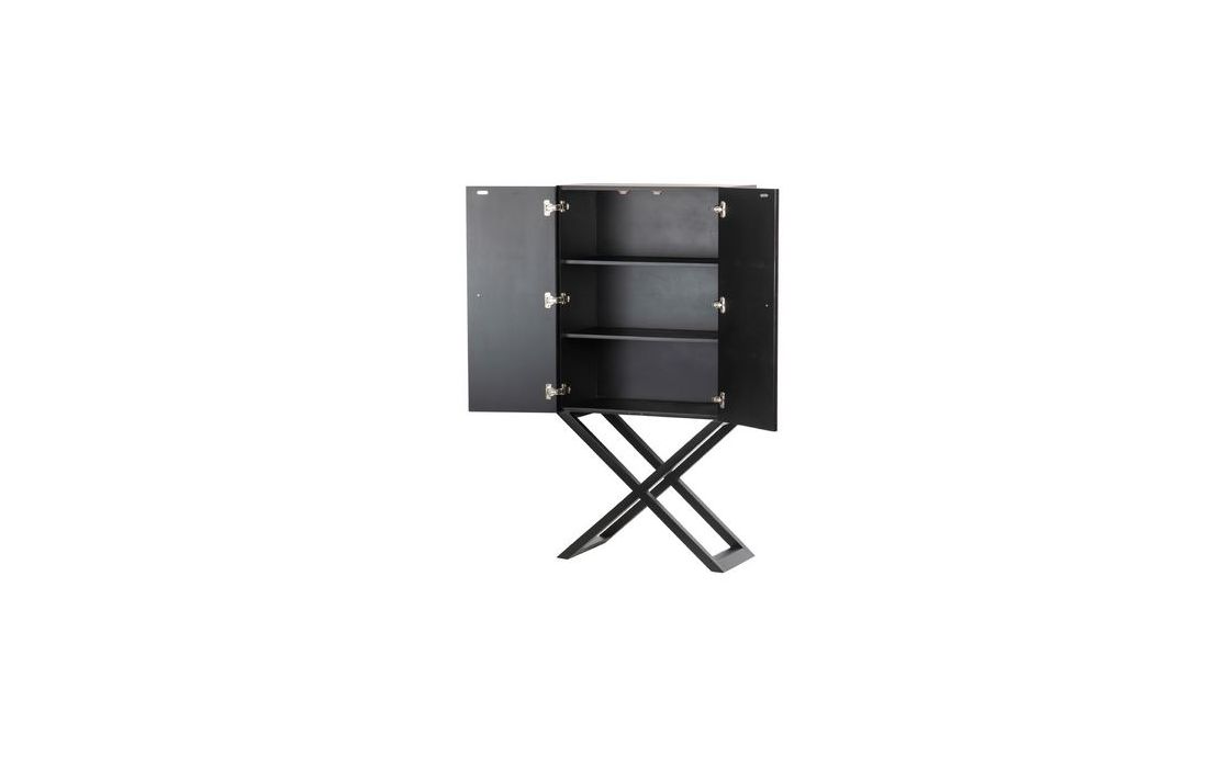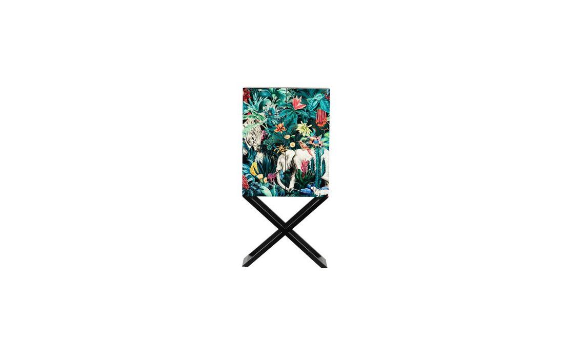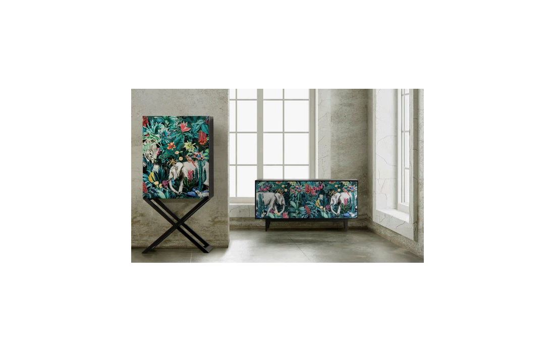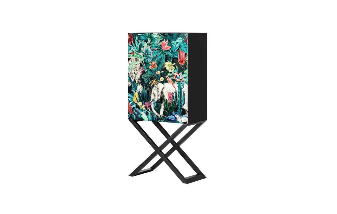 Móvel alto feito em madeira de bétula , com 2 portas multicolor com os pés em preto.